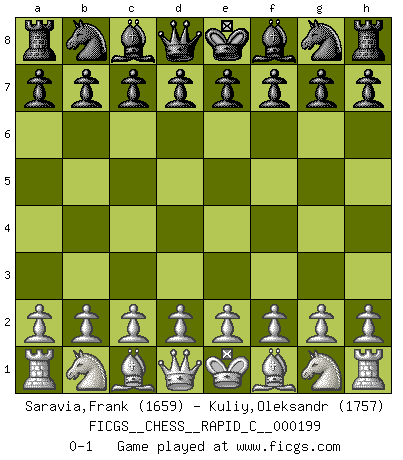 Last move : 0-1 2019 February 1 7:15:0 [Event "FICGS__CHESS__RAPID_C__000199"] [Site "FICGS"] [Date "2019.01.01"] [Round "1"] [White "Saravia,Frank"] [Black "Kuliy,Oleksandr"] [Result "0-1"] [WhiteElo "1659"] [BlackElo "1757"] 0-1 This chess game has been lost on time (started : 2019.01.01 22:17:16) Player Black won this chess game. Follow this game move after move (download)Every Pawn is a potential Queen. (James Mason) Zum Sieg gelangt man nicht, wenn man gut, sondern nur wenn man besser spielt (Savielly Grigorievitsch Tartakower) En partidas rápidas, el Caballo es mas poderoso que el Alfil. (Vlastimil Hort) On croit qu'il y a plus de mauvais joueurs que de bons joueurs, c'est faux : Il y a autant de joueurs qui gagnent que de joueurs qui perdent. (Philippe Geluck) Nothing is more important for teaching us to understand the concepts we have than constructing fictitious ones. (Ludwig Wittgenstein)