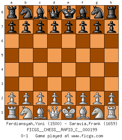 Last move : 0-1 2019 February 1 7:15:0 [Event "FICGS__CHESS__RAPID_C__000199"] [Site "FICGS"] [Date "2019.01.01"] [Round "1"] [White "Ferdiansyah,Yoni"] [Black "Saravia,Frank"] [Result "0-1"] [WhiteElo "1500"] [BlackElo "1659"] 0-1 This chess game has been lost on time (started : 2019.01.01 22:17:16) Player Black won this chess game. Follow this game move after move (download)I thought the most common mistake [in chess] was the first one: Learning the game :P (Garvin Gray, FICGS forum) Ich habe die Schachforschung dermaßen betrieben, dass sie auf eine wissenschaftliche Basis gestellt wurde. (Mikhail Moiseyevich Botvinik) Solo el jugador con la iniciativa tiene el derecho a atacar. (Wilhelm Steinitz) J'ai vu le vaincu d'Echecs jouer des années durant dans l'espoir de la fête de la victoire. Car tu es plus riche de ce qu'elle existe si même elle n'est point pour toi. Ainsi de la perle du fond des mers. (Antoine de Saint-Exupéry) Mandala - that's it! 16x16 squares as multiple of the four and the eight because of the Four Noble Truths and the Noble Eightfold Path. (Heinz-Georg Lehnhoff about Big Chess)
