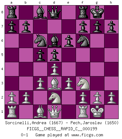 Last move : 0-1 2019 March 26 10:56:51 [Event "FICGS__CHESS__RAPID_C__000199"] [Site "FICGS"] [Date "2019.01.01"] [Round "1"] [White "Sorcinelli,Andrea"] [Black "Pech,Jaroslav"] [Result "0-1"] [WhiteElo "1667"] [BlackElo "1650"] 1.d4 d5 2.Nf3 Nf6 3.e3 e6 4.Bd3 c5 5.c3 Nc6 6.O-O Bd6 7.Nbd2 O-O 0-1 Colle system Kingside Castling by player White (move 6) Kingside Castling by player Black (move 7) Player Black won this chess game. Follow this game move after move (download)Chess is a terrible game. If you have no center, your opponent has a freer position. If you do have a center, then you really have something to worry about ! (Siegbert Tarrasch) Die Idee von Capablanca, Schach als Fach in den Schulen zu lehren, ist großartig. (Fidel Castro) Debemos de asegurarnos de que el Ajedrez no se convierta en un lenguaje muerto, muy interesante, pero solo para un grupo muy pequeño. (Sytze Faber) A ce moment-là, je menaçais de comprendre la position ! (Clément L'Heureux) Now you put water in a cup, it becomes the cup; You put water into a bottle it becomes the bottle; You put it in a teapot it becomes the teapot. Water can flow or it can crash. Be water, my friend. (Bruce Lee)