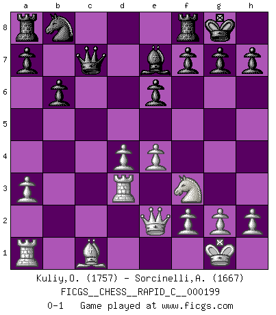 Last move : 0-1 2019 January 27 12:7:12 [Event "FICGS__CHESS__RAPID_C__000199"] [Site "FICGS"] [Date "2019.01.01"] [Round "1"] [White "Kuliy,Oleksandr"] [Black "Sorcinelli,Andrea"] [Result "0-1"] [WhiteElo "1757"] [BlackElo "1667"] 1.d4 Nf6 2.c4 e6 3.Nf3 b6 4.a3 Bb7 5.Nc3 d5 6.cxd5 Nxd5 7.Qc2 Nxc3 8.bxc3 Be7 9.e4 O-O 10.Bd3 c5 11.O-O cxd4 12.cxd4 Qc8 13.Qe2 Ba6 14.Rd1 Bxd3 15.Rxd3 Qc7 0-1 Queen's Indian : Petrosian system Kingside Castling by player Black (move 9) Kingside Castling by player White (move 11) Player Black won this chess game. Follow this game move after move (download)The defensive power of a pinned piece is only imaginary. (Aaron Nimzovich) Früher wurde jeder komplizierte Zug, jedes interessante Opfer mit großem Beifall und Enthusiasmus aufgenommen. Heute schaltet man einfach seinen Fritz an, und man kann sehen, was los ist, ob der Zug geht oder nicht. (Vladimir Kramnik) El muchacho (en ese entonces un niño de 12 años llamado Anatoly Karpov) no tiene ni idea de lo que es el Ajedrez y no hay futuro en absoluto para el en esta profesión. (Mikhail Botvinnik) Les Echecs mettent en conflit, non pas deux intelligences, mais deux volontés. (Lasker) There are lots of people who mistake their imagination for their memory. (Josh Bilings)