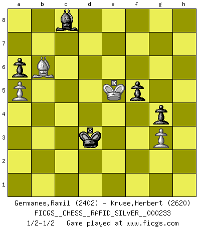 Last move : 1/2-1/2 2019 July 1 5:55:9 [Event "FICGS__CHESS__RAPID_SILVER__000233"] [Site "FICGS"] [Date "2019.01.02"] [Round "2"] [White "Germanes,Ramil"] [Black "Kruse,Herbert"] [Result "1/2-1/2"] [WhiteElo "2402"] [BlackElo "2620"] 1.e4 e5 2.Nf3 Nc6 3.Bb5 Nf6 4.d3 Bc5 5.c3 O-O 6.O-O d6 7.h3 Bb6 8.Re1 Ne7 9.d4 d5 10.Nxe5 Nxe4 11.Nd2 Nd6 12.Bd3 c6 13.Nb3 f6 14.Nf3 Ng6 15.Nc5 Re8 16.b3 Rxe1+ 17.Qxe1 Qe8 18.Qxe8+ Nxe8 19.c4 Bc7 20.Na4 Kf7 21.cxd5 cxd5 22.Nc3 Be6 23.Bd2 h5 24.Rc1 Ne7 25.Nb5 Bb8 26.Kf1 g6 27.Bb4 Nc6 28.Bc5 g5 29.Ne1 Bf4 30.Rc2 Bd7 31.Be2 g4 32.hxg4 hxg4 33.g3 Bh6 34.f4 b6 35.Ba3 a6 36.Nc3 Nxd4 37.Rd2 Nxe2 38.Kxe2 Nc7 39.Nxd5 Bb5+ 40.Kd1 Nxd5 41.Rxd5 Rc8 42.Kd2 Bc6 43.Rd4 Bg7 44.Rc4 Rd8+ 45.Ke3 Re8+ 46.Kf2 Be4 47.Rc7+ Kg8 48.Bb2 Bf8 49.Bd4 Re6 50.Ng2 Rd6 51.Be3 Rd3 52.Nh4 b5 53.Ra7 Rd6 54.f5 Rc6 55.Bd4 Ba3 56.Ng6 Bxf5 57.Ne7+ Bxe7 58.Rxe7 Bb1 59.a4 bxa4 60.bxa4 Bc2 61.a5 Kf8 62.Rb7 Re6 63.Rb6 Kf7 64.Rxe6 Kxe6 65.Ke3 f5 66.Kf4 Bb1 67.Bb6 Be4 68.Bd4 Kd5 69.Bf2 Kd6 70.Be3 Kd5 71.Bb6 Kc4 72.Ke3 Bb7 73.Kf4 Bc8 74.Ke5 Kd3 75.Bc5 Kc4 76.Bb6 Kd3 77.Bc5 Kc3 78.Bb6 Kd3 1/2-1/2 Ruy Lopez : Berlin defense Kingside Castling by player Black (move 5) Kingside Castling by player White (move 6) 10 pieces endgame at move 64 : White KRBPP , Black KBPPP WHITE : King + 1 Rook 1 Bishop 2 Pawns BLACK : King + 1 Bishop 3 Pawns 9 pieces endgame at move 64 : White KBPP , Black KBPPP WHITE : King + 1 Bishop 2 Pawns BLACK : King + 1 Bishop 3 Pawns This chess game ended in a draw. Follow this game move after move (download)Chess is a terrible game. If you have no center, your opponent has a freer position. If you do have a center, then you really have something to worry about ! (Siegbert Tarrasch) Matt entspricht nicht immer den Tatsachen. (Savielly Grigorievitsch Tartakower) El tablero es el mundo, las piezas es el fenomeno del universo, las reglas del juego son lo que llamamos leyes de la naturaleza y el jugador del lado opuesto, se encuentra oculto a nuestra vista. (Thomas Huxley) Tout change constamment, y compris dans le monde des Echecs. (Botvinnik) What doesn't kill us makes us stronger. (Friedrich Nietzsche)