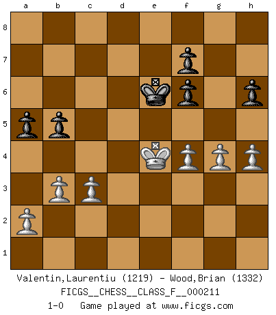 Last move : 1-0 2019 March 31 8:12:23 [Event "FICGS__CHESS__CLASS_F__000211"] [Site "FICGS"] [Date "2019.01.02"] [Round "1"] [White "Valentin,Laurentiu"] [Black "Wood,Brian"] [Result "1-0"] [WhiteElo "1219"] [BlackElo "1332"] 1.e4 c5 2.c3 e6 3.d4 d5 4.exd5 exd5 5.Nf3 Nf6 6.Be2 Nc6 7.O-O cxd4 8.Nxd4 Nxd4 9.Qxd4 Bd7 10.Bg5 Be7 11.Nd2 O-O 12.Bf3 Bc6 13.Rad1 Ne4 14.Bxe7 Qxe7 15.Rfe1 Qf6 16.Nxe4 dxe4 17.Qxf6 gxf6 18.Bxe4 Bxe4 19.Rxe4 Rfd8 20.Rde1 Kf8 21.g3 Re8 22.Kg2 Rxe4 23.Rxe4 Re8 24.Rxe8+ Kxe8 25.Kf3 Ke7 26.Ke4 Ke6 27.g4 h6 28.f4 b5 29.h4 a5 30.b3 1-0 Sicilian : Alapin's variation (2.c3) Kingside Castling by player White (move 7) Kingside Castling by player Black (move 11) Player White won this chess game. Follow this game move after move (download)Chess is a terrible game. If you have no center, your opponent has a freer position. If you do have a center, then you really have something to worry about ! (Siegbert Tarrasch) Schach ist mein Leben, meine Leidenschaft, was ich gelernt habe und seit meinem 14. Lebensjahr profimässig praktiziere. Darauf zu verzichten, würde mir sehr schwer fallen. (Viktor Kortschnoi) Nos gusta pensar. (Gary Kasparov) Le temps de noter son nom sur la feuille de partie, j'étais déjà en zeitnot ! D'un modeste amateur apparié lors de la première ronde d'un open contre le grand-maître Azmaïparashvili. Computers have lots of memory but no imagination. (Anonymous)