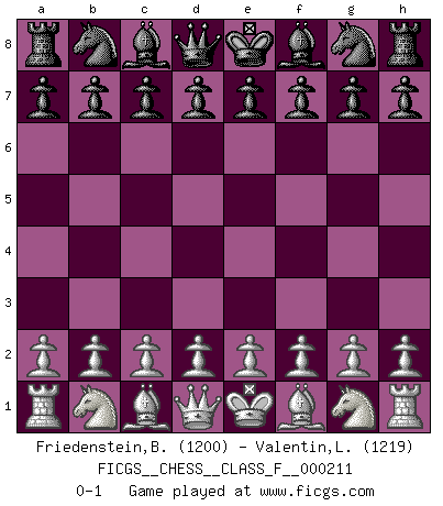 Last move : 0-1 2019 February 11 20:2:17 [Event "FICGS__CHESS__CLASS_F__000211"] [Site "FICGS"] [Date "2019.01.02"] [Round "1"] [White "Friedenstein,Brandon"] [Black "Valentin,Laurentiu"] [Result "0-1"] [WhiteElo "1200"] [BlackElo "1219"] 0-1 This chess game has been lost on time (started : 2019.01.02 11:41:8) Player Black won this chess game. Follow this game move after move (download)I feel as if I were a piece in a game of Chess, when my opponent says of it: That piece cannot be moved. (Soren Kierkegaard) Im Blitz ist es einfacher mit einer Figur weniger anzugreifen, als sich mit einer Mehrfigur zu verteidigen. (Mikhail Nekhemyevich Tal) Las Aperturas te enseñan aperturas. ¡Los Finales te enseñan Ajedrez!. (Stephan Gerzadowicz) Les échecs sont un jeu par leur forme, un art par leur essence et une science par sa difficulté d'acquisition. Ils peuvent vous procurer autant de plaisir qu'un bon livre ou une belle musique, mais vous n'aurez une réelle joie que si vous arrivez à bien jouer. (Tigran Petrosian) When you have everything, sometimes it feels like nothing. (Horatio Caine, C.S.I. Miami)