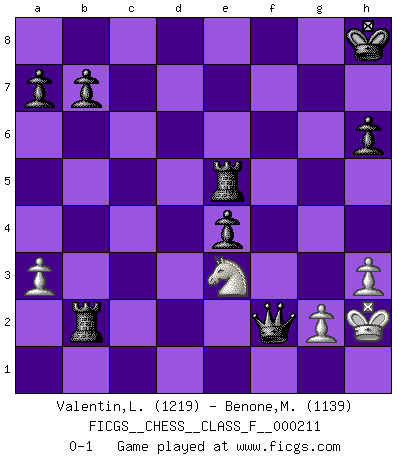Last move : 0-1 2019 March 7 11:35:47 [Event "FICGS__CHESS__CLASS_F__000211"] [Site "FICGS"] [Date "2019.01.02"] [Round "1"] [White "Valentin,Laurentiu"] [Black "Benone,Mateia"] [Result "0-1"] [WhiteElo "1219"] [BlackElo "1139"] 1.e4 Nf6 2.e5 Nd5 3.d4 d6 4.exd6 cxd6 5.c4 Nb6 6.Nc3 g6 7.Bf4 Bg7 8.Nf3 Bg4 9.Be2 O-O 10.O-O Nc6 11.a3 Bxf3 12.Bxf3 Nxc4 13.Qe2 Nb6 14.Rfe1 Nxd4 15.Qd3 Nxf3+ 16.Qxf3 Qd7 17.Rad1 Rfe8 18.Bg5 Rac8 19.Rc1 d5 20.Rcd1 d4 21.Ne4 f5 22.Nd2 e5 23.Qe2 h6 24.Bh4 g5 25.Nf3 gxh4 26.h3 e4 27.Nd2 Rc2 28.Qh5 Nd5 29.Qxh4 Rxb2 30.Nf1 Nc3 31.Ra1 d3 32.Qf4 Ne2+ 33.Rxe2 dxe2 34.Ne3 Qd2 35.Qxf5 e1Q+ 36.Rxe1 Qxe1+ 37.Kh2 Qxf2 38.Qd5+ Kh8 39.Qc5 Be5+ 40.Qxe5+ Rxe5 0-1 Alekhine's defense Kingside Castling by player Black (move 9) Kingside Castling by player White (move 10) Promotion Queen by player Black (move 35) Player Black won this chess game. Follow this game move after move (download)A thorough understanding of the typical mating continuations makes the most complicated sacrificial combinations leading up to them not only not difficult, but almost a matter of course. (Siegbert Tarrasch) Alle Schachspieler sollten auch ein Hobby haben. (Savielly Grigorievitsch Tartakower) Cuando me preguntan: -¿Cual es el secreto que te hace hacer mejores movidas que tus oponentes?, Yo respondo: Me da gusto que me pregunten eso, porque, como veran, hay una simple razón. Yo pienso mis propias movidas y dejo a mi oponente que el piense las suyas. (Alexander Alekhine) Ce qui caractérise les parties de combat, c'est que si le défenseur a constamment de difficiles problèmes à résoudre, l'attaquant doit chercher sans relâche de nouvelles possibilités d'attaque. (Koblentz) Man with more than one clock never knows what time it is. (Chinese thought)