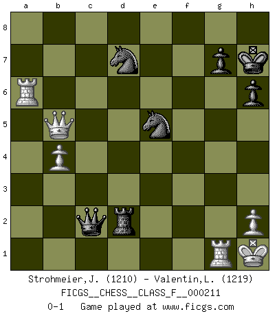 Last move : 0-1 2019 May 18 10:57:44 [Event "FICGS__CHESS__CLASS_F__000211"] [Site "FICGS"] [Date "2019.01.02"] [Round "1"] [White "Strohmeier,Josef"] [Black "Valentin,Laurentiu"] [Result "0-1"] [WhiteElo "1210"] [BlackElo "1219"] 1.e4 c5 2.Nf3 d6 3.d4 cxd4 4.Nxd4 a6 5.Nc3 e5 6.Nb3 Nc6 7.Nd5 f5 8.Bd3 fxe4 9.Bxe4 Nf6 10.Bg5 Be7 11.Nxe7 Qxe7 12.c3 O-O 13.Qd3 h6 14.Bh4 Be6 15.Bd5 Bxd5 16.f3 Qe6 17.O-O Bc4 18.Qg6 Bxb3 19.axb3 Qxb3 20.Rab1 Ne7 21.Qd3 d5 22.Rfe1 Nc6 23.Bg3 Rae8 24.Qd2 e4 25.Bd6 Rf7 26.Ra1 Ref8 27.Bxf8 Rxf8 28.Ra3 Qb6+ 29.Kh1 exf3 30.gxf3 Qc7 31.Rg1 Kh7 32.Qd3+ Kh8 33.Ra4 Ne5 34.Qe2 Nfd7 35.f4 b5 36.Rxa6 Rxf4 37.Qxb5 d4 38.Ra8+ Kh7 39.cxd4 Rxd4 40.Ra6 Rd2 41.b4 Qc2 0-1 Sicilian Kingside Castling by player Black (move 12) Kingside Castling by player White (move 17) Player Black won this chess game. Follow this game move after move (download)I know people who have all the will in the world, but still can't play good Chess. (Bobby Fischer) Ich habe die besten Aussichten, den ersten Preis zu gewinnen - denn jeder muss gegen Steinitz spielen, nur ich nicht! (Wilhelm Steinitz) En la perfecta combinación de Ajedrez como en una historia corta de primera clase, toda la trama y contra trama deberá conducir hacia un final sorprendente, el interes no es mitigado hasta el último momento. (Yates and Winter) Vous savez, camarade Pachman, je n'éprouve pas de plaisir à être ministre, je jouerais plutôt aux échecs comme vous, ou alors ferais une révolution au Venezuela. (Che Guevara à Ludek Pachman, 'Checkmate in Prague', 1975) A journey of a thousand sites begins with a single click. (Author unknown)