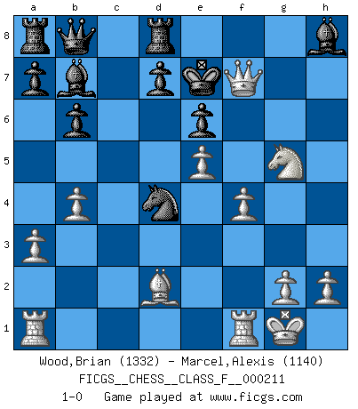 Last move : 1-0 2019 February 24 7:16:34 [Event "FICGS__CHESS__CLASS_F__000211"] [Site "FICGS"] [Date "2019.01.02"] [Round "1"] [White "Wood,Brian"] [Black "Marcel,Alexis"] [Result "1-0"] [WhiteElo "1332"] [BlackElo "1140"] 1.e4 g6 2.d4 Bg7 3.Nf3 c5 4.c3 cxd4 5.cxd4 Qa5+ 6.Nc3 e6 7.Be3 Nc6 8.Bd3 Nge7 9.O-O Nb4 10.Bb1 O-O 11.a3 Nbc6 12.e5 Rd8 13.b4 Qc7 14.Nb5 Qb8 15.Nd6 b6 16.Bd3 Nd5 17.Bd2 Bf8 18.Nxf7 Kxf7 19.Ng5+ Kg7 20.f4 Bb7 21.Nxh7 Nde7 22.Nf6 Nxd4 23.Bxg6 Kxg6 24.Qg4+ Kf7 25.Qh5+ Ng6 26.Nh7 Bg7 27.Ng5+ Ke7 28.Qxg6 Bh8 29.Qf7+ 1-0 Robatsch (Modern) defense Kingside Castling by player White (move 9) Kingside Castling by player Black (move 10) Player White won this chess game. Follow this game move after move (download)The Pawns are the soul of the game. (Francois Andre Danican Philidor) Über Frauen: Chess is better. (Robert James Fischer) Personalmente, yo prefiero mirar hacia el futuro en donde un programa de computadora gane el título mundial de Ajedrez. La humanidad necesita una lección de humildad. (Richard Dawkings) Mais l'homme est une créature légère et illogique : semblable au joueur d'échecs, il n'aime que le processus du but à atteindre, non le but lui-même. (Dostoïevsky) Never was anything great achieved without danger. (Niccolo Machiavelli)