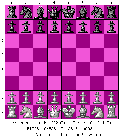 Last move : 0-1 2019 February 11 20:2:17 [Event "FICGS__CHESS__CLASS_F__000211"] [Site "FICGS"] [Date "2019.01.02"] [Round "1"] [White "Friedenstein,Brandon"] [Black "Marcel,Alexis"] [Result "0-1"] [WhiteElo "1200"] [BlackElo "1140"] 0-1 This chess game has been lost on time (started : 2019.01.02 11:41:8) Player Black won this chess game. Follow this game move after move (download)In Chess, as it is played by masters, chance is practically eliminated. (Emanuel Lasker) Mein Gehirn das ist mein zweitwichtigstes Organ [Aus dem Film: Der Schläfer]. (Woody Allen) El tablero es el mundo, las piezas es el fenomeno del universo, las reglas del juego son lo que llamamos leyes de la naturaleza y el jugador del lado opuesto, se encuentra oculto a nuestra vista. (Thomas Huxley) Les échecs sont un jeu terrible. Si vous n'avez pas le centre, votre adversaire a une position plus libre. Par contre, si vous avez le centre, alors vous avez vraiment quelque chose pour laquelle vous inquiéter ! (Siegbert Tarrasch) Warrior pose battles inner weakness and wins focus. You see that there is no war within you. You're on your own side, and you are your own strength. (Terri Guillemets)