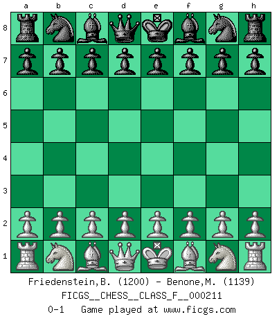 Last move : 0-1 2019 February 11 20:2:17 [Event "FICGS__CHESS__CLASS_F__000211"] [Site "FICGS"] [Date "2019.01.02"] [Round "1"] [White "Friedenstein,Brandon"] [Black "Benone,Mateia"] [Result "0-1"] [WhiteElo "1200"] [BlackElo "1139"] 0-1 This chess game has been lost on time (started : 2019.01.02 11:41:8) Player Black won this chess game. Follow this game move after move (download)There is only one thing Fischer does in Chess without pleasure: to lose ! (Boris Spassky) Fallen sollten polizeilich verboten werden. (Savielly Grigorievitsch Tartakower) El Ajedrez es un mar en el cual un mosquito puede beber y un elefante puede bañarse. (Refrán Hindú) Celui qui prend des risques peut perdre, celui qui n'en prend pas perd toujours. (Xavier Tartacover) All maxims have their antagonist maxims; proverbs should be sold in pairs, a single one being but a half truth. (William Mathews)