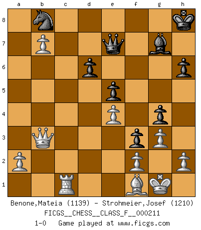 Last move : 1-0 2019 February 24 21:31:26 [Event "FICGS__CHESS__CLASS_F__000211"] [Site "FICGS"] [Date "2019.01.02"] [Round "1"] [White "Benone,Mateia"] [Black "Strohmeier,Josef"] [Result "1-0"] [WhiteElo "1139"] [BlackElo "1210"] 1.Nf3 Nf6 2.c4 g6 3.d4 Bg7 4.Nc3 O-O 5.e4 d6 6.Be2 e5 7.O-O Nc6 8.d5 Ne7 9.b4 Ne8 10.Qb3 f5 11.Bd3 Nf6 12.Re1 f4 13.c5 Bd7 14.c6 Bc8 15.cxb7 Bxb7 16.Ng5 Bc8 17.Bd2 h6 18.Ne6 Bxe6 19.dxe6 Qc8 20.Rac1 Kh8 21.b5 Rb8 22.Nd5 Qxe6 23.Nxf6 Qxf6 24.Rxc7 f3 25.g3 a6 26.b6 Rfc8 27.Rxc8+ Nxc8 28.b7 Ne7 29.Bxa6 g5 30.Ba5 Nc6 31.Bc7 g4 32.Bxb8 Nxb8 33.Bf1 Qe7 34.Rc1 1-0 Reti Opening Kingside Castling by player Black (move 4) Kingside Castling by player White (move 7) Player White won this chess game. Follow this game move after move (download)Chess is a cold bath for the mind. (Sir John Simon) Der vorletzte Fehler gewinnt. (Savielly Grigorievitsch Tartakower) Yo creo que el Ajedrez posee una magia que es también una ayuda en la edad avanzada. Una rodilla reumática es olvidada durante una partida de Ajedrez y otros eventos pueden parecer algo sin importancia comparada a una catástrofe en el tablero de Ajedrez. (Vlastimil Hort) Ce qui est bien, c'est d'avoir tout un tas de pièces en prise : l'adversaire ne peut en prendre qu'une à la fois. Cité par Thierry Audin. If you have any trouble condescending, find a Unix user to show you how it's done. (Scott Adams)