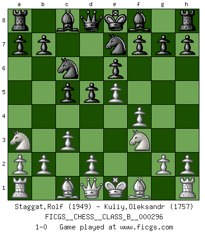 Last move : 1-0 2019 January 27 12:7:32 [Event "FICGS__CHESS__CLASS_B__000296"] [Site "FICGS"] [Date "2019.01.02"] [Round "1"] [White "Staggat,Rolf"] [Black "Kuliy,Oleksandr"] [Result "1-0"] [WhiteElo "1949"] [BlackElo "1757"] 1.e4 e6 2.f4 d5 3.e5 c5 4.Nf3 Nc6 5.c3 Nge7 6.Na3 1-0 French : Labourdonnais variation Player White won this chess game. Follow this game move after move (download)White lost because he failed to remember the right continuation and had to think up the moves himself. (Siegbert Tarrasch) Wer der Ansicht ist, daß alle Schachspieler verrückt sind, wird durch Studium des Lebens von Emil Josef Diemer nicht auf andere Gedanken kommen. (Hans Ree) Un buen sacrificio es aquel que aunque no sea necesariamente sólido, deja a tu oponente aturdido y confuso. (Rudolph Spielmann) Même si vous avez un bon coup à faire, regardez toujours s'il n'y en a pas un qui lui soit préférable. (Pedro Damiano) Inventor: A person who makes an ingenious arrangement of wheels, levers and springs, and believes it civilization. (Ambrose Bierce, The Devil's Dictionary)