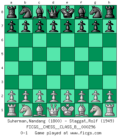 Last move : 0-1 2019 February 11 20:2:17 [Event "FICGS__CHESS__CLASS_B__000296"] [Site "FICGS"] [Date "2019.01.02"] [Round "1"] [White "Suherman,Nandang"] [Black "Staggat,Rolf"] [Result "0-1"] [WhiteElo "1800"] [BlackElo "1949"] 0-1 This chess game has been lost on time (started : 2019.01.02 19:56:24) Player Black won this chess game. Follow this game move after move (download)To avoid losing a piece, many a person has lost the game. (Savielly Tartakover) Schach ist das Spiel, das die Verrückten gesund hält. (Albert Einstein) El Ajedrez es un mar en el cual un mosquito puede beber y un elefante puede bañarse. (Refrán Hindú) Les écrivains ont utilisé les échecs pour analyser les côtés extrêmes de la nature humaine. Dans ce cadre, les échecs offrent un champ d'expérimentation idéal. Mais on pourrait faire la même chose avec la peinture. Et là, en vous référant à Van Gogh, vous ne tirerez pas de conclusion définitive sur les peintres. (Gary Kasparov) I believe in luck. How else can you explain the success of those you dislike ? (Jean Cocteau)