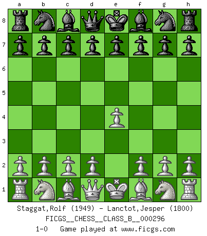 Last move : 1-0 2019 February 12 8:19:19 [Event "FICGS__CHESS__CLASS_B__000296"] [Site "FICGS"] [Date "2019.01.02"] [Round "1"] [White "Staggat,Rolf"] [Black "Lanctot,Jesper"] [Result "1-0"] [WhiteElo "1949"] [BlackElo "1800"] 1.e4 1-0 This chess game has been lost on time (started : 2019.01.02 19:56:24) King's pawn Opening Player White won this chess game. Follow this game move after move (download)My style is somewhere between that of Tal and Petrosian. (Reshevsky) Alle Schachspieler sollten auch ein Hobby haben. (Savielly Grigorievitsch Tartakower) Cuando me preguntan: -¿Cual es el secreto que te hace hacer mejores movidas que tus oponentes?, Yo respondo: Me da gusto que me pregunten eso, porque, como veran, hay una simple razón. Yo pienso mis propias movidas y dejo a mi oponente que el piense las suyas. (Alexander Alekhine) Nous vivons dans un monde échiquéen : chaque jour qui passe est un défi à relever. (Philosophe Sasha) He is a liar. I just don't know what the lie is yet. (Horatio Caine, C.S.I. Miami)
