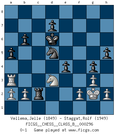Last move : 0-1 2019 March 27 18:1:3 [Event "FICGS__CHESS__CLASS_B__000296"] [Site "FICGS"] [Date "2019.01.05"] [Round "1"] [White "Vellema,Jelle"] [Black "Staggat,Rolf"] [Result "0-1"] [WhiteElo "1849"] [BlackElo "1949"] 1.d4 Nf6 2.Nf3 e6 3.e3 b6 4.Bd3 Bb7 5.Nbd2 c5 6.c3 Nc6 7.O-O Be7 8.e4 cxd4 9.cxd4 Nb4 10.Bb1 Ba6 11.Re1 Nd3 12.Bxd3 Bxd3 13.Qb3 Ba6 14.e5 Nd5 15.Ne4 O-O 16.Bg5 Bb7 17.Bxe7 Nxe7 18.Nd6 Bd5 19.Qa3 Nc6 20.Rac1 f6 21.Re3 Bxf3 22.Rxf3 Nxd4 23.Re3 fxe5 24.Rxe5 Qf6 25.Qe3 Nc6 26.Rb5 Qf4 27.Rd1 Qa4 28.Qb3 Qxb3 29.Rxb3 Ne7 30.Rc3 Nd5 31.Ra3 g6 32.Rd4 Kg7 33.Rda4 a5 34.Rc4 Kf6 35.Ne4+ Ke7 36.Ng5 Rac8 37.Rxc8 Rxc8 38.g3 h5 39.Nf3 Rc2 40.Ne5 g5 41.Nd3 Kd6 42.Kg2 e5 43.Kf3 g4+ 44.Kg2 e4 0-1 Queen's pawn : Yusupov-Rubinstein system Kingside Castling by player White (move 7) Kingside Castling by player Black (move 15) Player Black won this chess game. Follow this game move after move (download)The game of chess is the touchstone of the intellect. (Goethe) Die Elozahlen sind sehr schlecht für das Schach. Jetzt ist Schach eine Sportindustrie, die darauf zielt Elopunkte zu machen. (Miguel Najdorf) No soy una persona materialista y por eso, no resiento la falta o pérdida del dinero. La ausencia de cosas mundanas carece de importancia. Ya que el Ajedrez es una forma en la que puedo ser tan materialista como yo desee sin tener la necesidad de vender mi alma. (Jamie Walter Adams) L'attaque fait le spectacle, la défense gagne les matchs. (Dicton footballistique) It's not enough to succeed. Others must fail. (Gore Vidal)