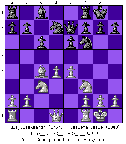 Last move : 0-1 2019 January 27 12:7:43 [Event "FICGS__CHESS__CLASS_B__000296"] [Site "FICGS"] [Date "2019.01.05"] [Round "1"] [White "Kuliy,Oleksandr"] [Black "Vellema,Jelle"] [Result "0-1"] [WhiteElo "1757"] [BlackElo "1849"] 1.d4 Nf6 2.c4 e6 3.Nf3 d5 4.Nc3 c6 5.Bg5 Be7 6.e3 Nbd7 7.Bd3 O-O 8.O-O dxc4 9.Bxc4 Nd5 10.Bxe7 Qxe7 11.e4 N5f6 0-1 Queen's pawn game Kingside Castling by player Black (move 7) Kingside Castling by player White (move 8) Player Black won this chess game. Follow this game move after move (download)I played Chess with him and would have beaten him sometimes only he always took back his last move, and ran the game out differently. (Mark Twain) Das Schachspiel übertrifft alle anderen Spiele so weit wie der Chimborasso einen Misthaufen. (Arthur Schopenhauer) Tu sabes que vas a perder. Aún cuando tenía la ventaja, yo sabía que iba a perder. - al estar jugando con Fischer (Andrew Soltis) Ne tendez aucun piège pour le plaisir ! Ne jouez rien dans l'espoir que l'adversaire réagisse de façon stupide ! Prenez toujours pour acquis que l'adversaire va trouver le meilleur coup ! Ne jouez jamais de coup dans l'espoir que l'adversaire ne voie pas la menace ! Chacun de vos coups doit améliorer la position d'une façon ou d'une autre. Beta. Software undergoes beta testing shortly before it's released. Beta is latin for still doesn't work. (Anonymous)