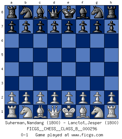 Last move : 0-1 2019 February 11 20:2:17 [Event "FICGS__CHESS__CLASS_B__000296"] [Site "FICGS"] [Date "2019.01.02"] [Round "1"] [White "Suherman,Nandang"] [Black "Lanctot,Jesper"] [Result "0-1"] [WhiteElo "1800"] [BlackElo "1800"] 0-1 This chess game has been lost on time (started : 2019.01.02 19:56:24) Player Black won this chess game. Follow this game move after move (download)Chess is the gymnasium of the mind. (Blaise Pascal) Obwohl ich vom Stil her kaum zu den Priestern der Schachkunst gezählt werde, halte ich Schach doch für eine Kunst. (Tigran Petrosjan) La señal de un Gran Maestro es su habilidad de ganar una partida rápidamente y sin dolor. (Irving Chernev) Le système Elo représente seulement une moyenne. Il est simplement un indicateur de votre stabilité. (Anatoli Karpov) Opportunities multiply as they are seized. (Sun Tzu)