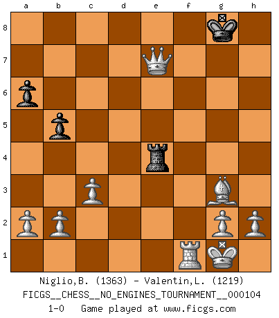 Last move : 1-0 2019 April 28 5:57:24 [Event "FICGS__CHESS__NO_ENGINES_TOURNAMENT__000104"] [Site "FICGS"] [Date "2019.01.03"] [Round "1"] [White "Niglio,Biagio"] [Black "Valentin,Laurentiu"] [Result "1-0"] [WhiteElo "1363"] [BlackElo "1219"] 1.d4 d5 2.Nf3 Nf6 3.Bf4 Bg4 4.e3 e6 5.Nbd2 a6 6.Be2 c5 7.c3 Be7 8.Ne5 Bxe2 9.Qxe2 O-O 10.O-O Nbd7 11.Bg3 Rc8 12.f4 cxd4 13.exd4 Nxe5 14.fxe5 Nd7 15.Rf3 Nb6 16.Raf1 Nc4 17.Nxc4 Rxc4 18.Be1 b5 19.Qf2 f5 20.exf6 Bxf6 21.Qe2 Qe7 22.Bg3 e5 23.dxe5 Re4 24.exf6 Rxf6 25.Qd1 h5 26.Qxd5+ Kh8 27.Rxf6 gxf6 28.Qxh5+ Kg8 29.Qg6+ Kh8 30.Qxf6+ Kg8 31.Qxe7 1-0 Queen's Bishop game Kingside Castling by player Black (move 9) Kingside Castling by player White (move 10) Player White won this chess game. Follow this game move after move (download)Chess is war over the board. The object is to crush the opponents mind. (Bobby Fischer) Das Blackmar-Diemer-Gambit verändert den ganzen Menschen! (Emil Joseph Diemer) No solamente yo pronostico su triunfo sobre Botvinnik, sino que me adelanto y digo que probablemente Fischer es el jugador de Ajedrez mas grande que haya existido. (John Collins) Toute estimation doit être constamment réévaluée. (Jacob Estrin) Yoga is 99% practice and 1% knowledge. (Sri Krishna Pattabhi Jois)
