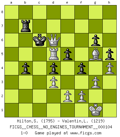Last move : 1-0 2019 April 12 8:6:39 [Event "FICGS__CHESS__NO_ENGINES_TOURNAMENT__000104"] [Site "FICGS"] [Date "2019.01.03"] [Round "1"] [White "Hilton,Stephen"] [Black "Valentin,Laurentiu"] [Result "1-0"] [WhiteElo "1795"] [BlackElo "1219"] 1.Nf3 d5 2.c4 e6 3.g3 Nf6 4.Bg2 Be7 5.O-O O-O 6.b3 dxc4 7.bxc4 c5 8.Bb2 Nc6 9.Nc3 Nd4 10.Nxd4 cxd4 11.Ne4 e5 12.Nxf6+ Bxf6 13.d3 Qc7 14.Qb3 Rb8 15.Ba3 Re8 16.Rab1 Be6 17.Qa4 a6 18.Bb4 b5 19.cxb5 axb5 20.Qa6 Bxa2 21.Qxa2 Be7 22.Rfc1 Qb6 23.Bc6 Rec8 24.Bxe7 Rxc6 25.Rxc6 Qxc6 26.Bb4 h5 27.h4 g6 28.Qb2 Kg7 29.Rc1 Qe6 30.Rc5 f5 31.Rc7+ Kf6 32.Be7+ Kf7 33.Qb4 Kg8 34.Bg5 f4 35.Re7 Qd5 36.Ra7 Rb7 37.Ra8+ Kf7 38.Qf8+ Ke6 39.Qf6+ Kd7 40.Rd8+ Kc7 41.Rxd5 b4 42.Qd8+ Kc6 43.Qd6+ 1-0 Reti Opening Kingside Castling by player White (move 5) Kingside Castling by player Black (move 5) Player White won this chess game. Follow this game move after move (download)You may learn much more from a game you lose than from a game you win. You will have to lose hundreds of games before becoming a good player. (Jose Raul Capablanca) Wenn du gegen Bobby spielst, ist es keine Frage von gewinnen oder verlieren. Es ist eine Frage des Überlebens. (Boris Vassilievich Spassky) Estaba muy claro de que el punto vulnerable del Gran Maestro Americano (Bobby Fischer) radicaba en las posiciones de doble filo, colgantes, irracionales, donde el siempre falló en encontrar un triunfo aún en una posición de clara victoria. (Efim Geller) Vous savez, camarade Pachman, je n'éprouve pas de plaisir à être ministre, je jouerais plutôt aux échecs comme vous, ou alors ferais une révolution au Venezuela. (Che Guevara à Ludek Pachman, 'Checkmate in Prague', 1975) God, you are such an idiot. - Actually, I thought I was more of a jerk. (Gregory House to Stacy Warner, House M.D.)