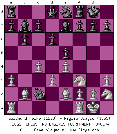Last move : 0-1 2019 February 3 17:33:39 [Event "FICGS__CHESS__NO_ENGINES_TOURNAMENT__000104"] [Site "FICGS"] [Date "2019.01.03"] [Round "1"] [White "Goldmund,Heike"] [Black "Niglio,Biagio"] [Result "0-1"] [WhiteElo "1278"] [BlackElo "1363"] 1.b4 Nf6 2.Bb2 e6 3.e3 Bxb4 4.c4 O-O 5.a3 Be7 6.Nf3 b6 7.Qc2 Bb7 8.Be2 d6 9.O-O Nbd7 10.d3 e5 11.Nbd2 Nc5 12.e4 Ne8 13.h3 Ne6 14.Nh2 Nd4 15.Ndf3 Nxc2 0-1 Polish (Sokolsky) opening Kingside Castling by player Black (move 4) Kingside Castling by player White (move 9) Player Black won this chess game. Follow this game move after move (download)Chess is in its essence a game, in its form an art, and in its execution a science. (Baron Tassilo) Zu meiner Zeit war ein 20 jähriger ein junger Spieler, heute ist er ein Veteran. (Garry Kasparov) El Ajedrez es un mar en el cual un mosquito puede beber y un elefante puede bañarse. (Refrán Hindú) Le jeu d'échecs fait naître et fortifie en nous plusieurs qualités précieuses dans le cours de l'existence, telles que la prévoyance, la circonspection, la prudence, et la persévérance. (Benjamin Franklin - 1783, la morale des échecs) Over-the-board chess is the favorite of mortals, correspondence chess is the favorite of the gods. (Eduard Dyckhoff)