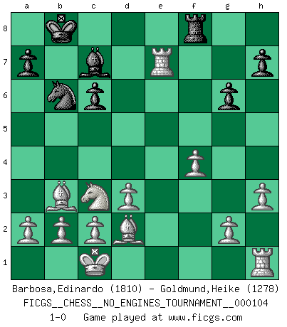 Last move : 1-0 2019 February 14 21:12:57 [Event "FICGS__CHESS__NO_ENGINES_TOURNAMENT__000104"] [Site "FICGS"] [Date "2019.01.03"] [Round "1"] [White "Barbosa,Edinardo"] [Black "Goldmund,Heike"] [Result "1-0"] [WhiteElo "1810"] [BlackElo "1278"] 1.e4 d5 2.exd5 Qxd5 3.Nc3 Qa5 4.Bc4 Nf6 5.d3 Bf5 6.Qf3 c6 7.Bd2 e6 8.h3 Qc7 9.O-O-O Bd6 10.Re1 Nbd7 11.Qxf5 Nb6 12.Bb3 O-O-O 13.Qg5 g6 14.Qxf6 Be7 15.Qf3 Rhe8 16.Qxf7 Rf8 17.Qxe6+ Rd7 18.Nf3 Bd8 19.Re2 Kb8 20.Qe5 Qxe5 21.Nxe5 Re7 22.f4 Bc7 23.Nxc6+ bxc6 24.Rxe7 1-0 Scandinavian (centre counter) defense Queenside Castling by player White (move 9) Queenside Castling by player Black (move 12) Player White won this chess game. Follow this game move after move (download)Chess teaches you to control the initial excitement you feel when you see something that looks good and it trains you to think objectively when you're in trouble. (Stanley Kubrick) Ich habe die Schachforschung dermaßen betrieben, dass sie auf eine wissenschaftliche Basis gestellt wurde. (Mikhail Moiseyevich Botvinik) El ganador de una partida es aquel jugador que hace el penúltimo error. (Savielly Tartakover) L'action d'une oeuvre littéraire se déroule sur un champ de bataille. Les masques et les types du drame moderne correspondent aux pièces du jeu d'échecs. L'intrigue correspond aux coups et aux gambits, c'est à dire aux techniques du jeu telles qu'utilisées et interprétées par les joueurs. Les tactiques et les péripéties [mouvements] correspondent aux coups exécutés par l'adversaire. (Viktor Shklovsky) When you stop learning you start dying. (M. Scott Adams)