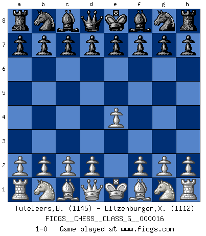 Last move : 1-0 2007 July 8 16:19:0 [Event "FICGS__CHESS__CLASS_G__000016"] [Site "FICGS"] [Date "2007.05.29"] [Round "1"] [White "Tuteleers,Bruno"] [Black "Litzenburger,Xavier"] [Result "1-0"] [WhiteElo "1145"] [BlackElo "1112"] 1.e4 1-0 This chess game has been lost on time (started : 2007.05.29 4:43:35) King's pawn Opening Player White won this chess game. Follow this game move after move (download)The Pawns are the soul of the game. (Francois Andre Danican Philidor) Lisa Lane, amerikanische Schachmeisterin, hatte Fischer einmal als stärksten lebenden Spieler bezeichnet. Antwort: Das ist richtig, aber Lisa Lane ist eigentlich nicht in der Lage, das zu beurteilen. (Robert James Fischer) El Rey es una pieza de pelea. ¡Usenlo!. (Wilhelm Steinitz) Il (Jacob Murray) ne joue pas pour le bon coup, mais pour le meilleur. (Eloi Relange) Locking firmely the window serves nothing, only small thiefs pass through there, the big thiefs enter through the front door. (Luc-Olivier Leclerc)