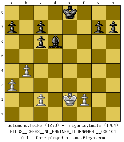 Last move : 0-1 2019 January 27 20:27:6 [Event "FICGS__CHESS__NO_ENGINES_TOURNAMENT__000104"] [Site "FICGS"] [Date "2019.01.03"] [Round "1"] [White "Goldmund,Heike"] [Black "Trigance,Emile"] [Result "0-1"] [WhiteElo "1278"] [BlackElo "1764"] 1.e4 e5 2.Nf3 Nf6 3.Nc3 Nc6 4.Bc4 Nxe4 5.Nxe4 d5 6.Bb5 dxe4 7.Nxe5 Qg5 8.Bxc6+ bxc6 9.d4 Qxg2 10.Rf1 Bh3 11.Qe2 Qxf1+ 12.Qxf1 Bxf1 13.Kxf1 Bd6 14.Bf4 O-O 15.Re1 f6 16.Rxe4 fxe5 17.dxe5 Rxf4 18.Rxf4 Bxe5 19.Re4 Bxh2 20.Ke2 Bd6 21.a3 Kf7 22.b4 Re8 23.Rxe8 Kxe8 0-1 Petrov Three knights game Kingside Castling by player Black (move 14) Player Black won this chess game. Follow this game move after move (download)You can only get good at Chess if you love the game. (Bobby Fischer) Die Leute spielen gegen mich seit 15 Jahren unter Ihren Möglichkeiten. (Robert James Fischer) Yo no le temo a Spassky. Todos saben que yo soy el mejor. Uno no necesita un torneo para probarlo. (Bobby Fischer) Echiquier : carré parfait, comme la Jérusalem nouvelle décrite par l'auteur de l'Apocalypse, huit cases sur huit, exaltation du chiffre 4, symbole du cosmos aux quatre horizons... où le noir et le blanc, l'ombre et la lumière, le mal et le bien s'entremêlent et se conjuguent. (Robert Couffignal, Le Gambit du poète) Pushing plastic is for the many, pushing virtual pieces is for the fewer, pushing wood is for the very few. (Normajean Yates)