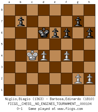 Last move : 0-1 2019 March 24 16:43:2 [Event "FICGS__CHESS__NO_ENGINES_TOURNAMENT__000104"] [Site "FICGS"] [Date "2019.01.03"] [Round "1"] [White "Niglio,Biagio"] [Black "Barbosa,Edinardo"] [Result "0-1"] [WhiteElo "1363"] [BlackElo "1810"] 1.d4 d5 2.Nf3 c5 3.c3 e6 4.Bf4 Nc6 5.e3 Qb6 6.Qb3 Nf6 7.Nbd2 cxd4 8.exd4 Qxb3 9.axb3 Be7 10.Bd3 Bd7 11.O-O O-O 12.b4 a6 13.b5 axb5 14.Bxb5 Na7 15.Bxd7 Nxd7 16.Ra2 Nc6 17.Rfa1 Rxa2 18.Rxa2 h6 19.b4 Rc8 20.b5 Nd8 21.Nb1 Nb6 22.Kf1 Ra8 23.Rxa8 Nxa8 24.Ke2 Nb6 25.Kd3 f6 26.Nbd2 Nf7 27.Bc7 Nc8 28.c4 Ncd6 29.b6 dxc4+ 30.Nxc4 Kf8 31.Nh4 Ke8 32.Ng6 Nxc4 33.Nxe7 Nxb6 34.Bxb6 Kxe7 35.f4 Kd7 36.Kc4 Kc6 37.Bc5 Nd6+ 38.Bxd6 Kxd6 0-1 Queen's pawn game, Krause variation Kingside Castling by player White (move 11) Kingside Castling by player Black (move 11) Player Black won this chess game. Follow this game move after move (download)There just isn't enough televised Chess. (David Letterman) Eine Person mit durchschnittlichem IQ kann etwa eine ELO von 2000 erreichen. (Jonathan Levitt) No volvere nunca a jugar contigo. Has insultado a mi amigo. - cuando un oponente se maldijo por una mala jugada (Miguel Najdorf) Demandez au pauvre Cg1 ce qu'il en pense. Eduard Gufeld à propos de la variante Saemisch de l'Est-Indienne. I don't believe in psychology. I believe in good moves. (Bobby Fischer)