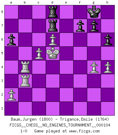 Last move : 1-0 2019 January 8 11:1:19 [Event "FICGS__CHESS__NO_ENGINES_TOURNAMENT__000104"] [Site "FICGS"] [Date "2019.01.03"] [Round "1"] [White "Baum,Jurgen"] [Black "Trigance,Emile"] [Result "1-0"] [WhiteElo "1800"] [BlackElo "1764"] 1.e4 e5 2.f4 d5 3.exd5 e4 4.d3 Nf6 5.dxe4 Nxe4 6.Nf3 Bc5 7.Qe2 Bf5 8.Nc3 Qe7 9.Be3 Bb4 10.Bd4 O-O 11.O-O-O Nxc3 12.Bxc3 Qxe2 13.Bxe2 Bxc3 14.bxc3 Nd7 15.Rhe1 a6 16.Ne5 Rae8 17.Bd3 Nxe5 18.fxe5 Bxd3 19.Rxd3 Rd8 20.c4 b6 21.Kd2 Rfe8 22.Kc3 Kf8 23.Kd4 Re6 24.Rf3 Kg8 25.Ref1 Re7 26.Re1 Re6 27.Re4 Re7 28.g4 h6 29.h4 Kh7 30.c5 Red7 31.c4 Kg8 32.Rb3 b5 33.d6 cxd6 34.exd6 bxc4 35.Kxc4 Rc8 36.Kd5 Rcd8 37.Reb4 1-0 KGD : Falkbeer, Main line, 7...Bf5 Kingside Castling by player Black (move 10) Queenside Castling by player White (move 11) Player White won this chess game. Follow this game move after move (download)One bad move nullifies forty good ones. (Horowitz) Es genügt nicht ein guter Spieler zu sein, man muß auch gut spielen. (Siegbert Tarrasch) Si yo gano un torneo, yo lo gano por mí mismo. Yo hago las jugadas. Nadie me ayuda. (Bobby Fischer) On entre au jeu d'Echecs comme on entre en Religion. Pour le joueur d'Echecs, la partie d'Echecs c'est l'office, la messe, le défilé du 1er Mai, le dépôt de gerbe au Monument aux Morts. C'est un drame sacré. (Michel Roos) The leaves of memory seemed to make a mournful rustling in the dark. (Henry Wadsworth Longfellow)