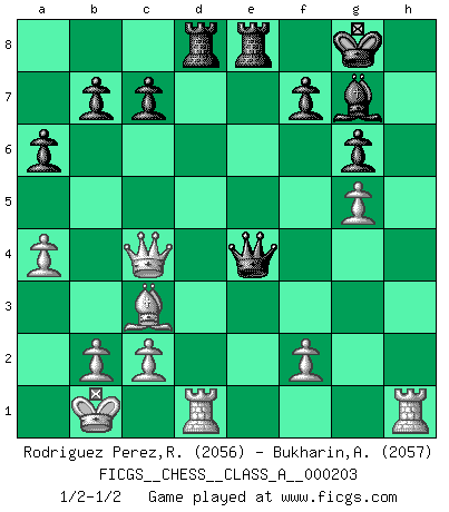 Last move : 1/2-1/2 2019 April 18 23:10:58 [Event "FICGS__CHESS__CLASS_A__000203"] [Site "FICGS"] [Date "2019.01.05"] [Round "1"] [White "Rodriguez Perez,Rene"] [Black "Bukharin,Alexey"] [Result "1/2-1/2"] [WhiteElo "2056"] [BlackElo "2057"] 1.e4 g6 2.Nc3 Bg7 3.d4 d6 4.Be3 a6 5.a4 Nf6 6.h3 O-O 7.g4 e5 8.dxe5 dxe5 9.g5 Nfd7 10.Nf3 Nc6 11.Qd2 Nb4 12.h4 Qe7 13.Bh3 Re8 14.O-O-O Nf8 15.Bxc8 Raxc8 16.h5 Rcd8 17.Qe2 Ne6 18.Qc4 Nd4 19.hxg6 hxg6 20.Nxd4 exd4 21.Bxd4 Na2+ 22.Kb1 Nxc3+ 23.Bxc3 Qxe4 1/2-1/2 Robatsch (Modern) defense Kingside Castling by player Black (move 6) Queenside Castling by player White (move 14) This chess game ended in a draw. Follow this game move after move (download)It is always better to sacrifice your opponent's men. (Savielly Tartakower) Er war ein guter Schachspieler, aber ich kann Leute nicht ausstehen, die 'Heil Hitler' rufen (Über Alexander Aljechin). (Miguel Najdorf) Cuando veas una buena jugada, trata de encontrar otra mejor. (Emanuel Lasker) Vous savez, camarade Pachman, je n'éprouve pas de plaisir à être ministre, je jouerais plutôt aux échecs comme vous, ou alors ferais une révolution au Venezuela. (Che Guevara à Ludek Pachman, 'Checkmate in Prague', 1975) Art is the only way to run away without leaving home. (Twyla Tharp)