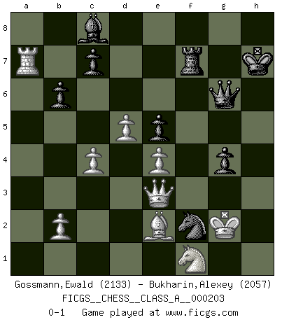 Last move : 0-1 2019 June 12 21:6:28 [Event "FICGS__CHESS__CLASS_A__000203"] [Site "FICGS"] [Date "2019.01.05"] [Round "1"] [White "Gossmann,Ewald"] [Black "Bukharin,Alexey"] [Result "0-1"] [WhiteElo "2133"] [BlackElo "2057"] 1.e4 g6 2.d4 Bg7 3.Nf3 d6 4.Bd3 Nf6 5.c3 O-O 6.O-O Nc6 7.h3 e5 8.Re1 h6 9.Bc2 Nd7 10.Na3 Kh7 11.Nc4 Nb6 12.Nxb6 axb6 13.d5 Ne7 14.c4 f5 15.Be3 f4 16.Bd2 g5 17.Bd3 Qe8 18.Nh2 h5 19.Be2 Kh6 20.a4 Ng8 21.Qc2 Nf6 22.a5 bxa5 23.Bxa5 b6 24.Bd2 Rxa1 25.Rxa1 g4 26.hxg4 hxg4 27.g3 Qg6 28.gxf4 exf4 29.Bxf4+ Kh7 30.Bg3 Nh5 31.Qd3 Be5 32.Bxe5 dxe5 33.Ra7 Rf7 34.Nf1 Nf4 35.Qe3 Nh3+ 36.Kg2 Nxf2 0-1 Robatsch (Modern) defense Kingside Castling by player Black (move 5) Kingside Castling by player White (move 6) Player Black won this chess game. Follow this game move after move (download)When you don't know what to do, wait for your opponent to get an idea - it's sure to be wrong. (Tarrasch) Ich habe kein Problem mit Frauen, sondern nur mit dem Niveau ihres Schachspiels (Judith Polgar) El Ajedrez es de 30 a 40 por ciento psicología. Uno no cuenta con esto cuando se juega contra una computadora. No lo puedo confundir. (Judith Polgar) Karpov est une pièce de musée. (Garry Kasparov) Luck has a peculiar habit of favoring those who don't depend on it. (Author unknown)