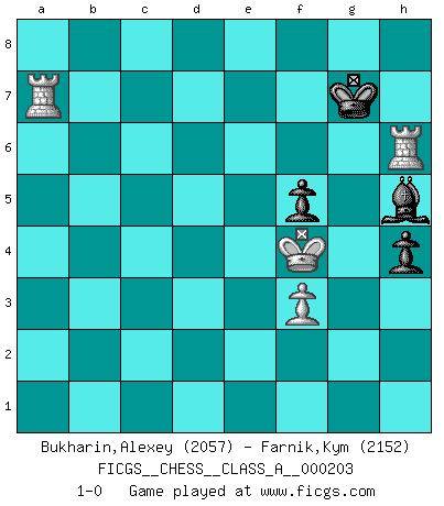 Last move : 1-0 2019 June 28 1:33:34 [Event "FICGS__CHESS__CLASS_A__000203"] [Site "FICGS"] [Date "2019.01.05"] [Round "1"] [White "Bukharin,Alexey"] [Black "Farnik,Kym"] [Result "1-0"] [WhiteElo "2057"] [BlackElo "2152"] 1.e4 c5 2.Nf3 d6 3.d4 cxd4 4.Nxd4 Nf6 5.Nc3 a6 6.Bg5 e6 7.f4 h6 8.Bh4 Qb6 9.Qd2 Qxb2 10.Rb1 Qa3 11.e5 dxe5 12.fxe5 Nfd7 13.Ne4 Qxa2 14.Rd1 Qd5 15.Qe3 Qxe5 16.Be2 Bc5 17.Bg3 Bxd4 18.Rxd4 Qa5+ 19.Rd2 O-O 20.Bd6 Nc6 21.O-O f5 22.Bxf8 Nxf8 23.Nd6 Qe5 24.Qxe5 Nxe5 25.Rb1 b5 26.Ra1 Bd7 27.Nxb5 a5 28.c4 Nfg6 29.Rda2 Nc6 30.Bf3 Nge5 31.Rd1 Nxf3+ 32.gxf3 Be8 33.Nc7 Rc8 34.Nxe6 Bf7 35.Nd4 Rd8 36.Rad2 Ne5 37.c5 Rd5 38.c6 Rc5 39.Re1 Nxc6 40.Nxc6 Rxc6 41.Re7 g5 42.Ra7 a4 43.R2d7 Rf6 44.h4 Bh5 45.Kg2 Rf7 46.Rd8+ Kg7 47.Rxa4 Rc7 48.Rd6 Rc2+ 49.Kg3 Rc7 50.Ra5 Rf7 51.R5a6 gxh4+ 52.Kf4 Rb7 53.Rxh6 Ra7 54.Rxa7+ 1-0 Sicilian : Najdorf, 7.f4 Kingside Castling by player Black (move 19) Kingside Castling by player White (move 21) 10 pieces endgame at move 51 : White KRRP , Black KRBPPP WHITE : King + 2 Rooks 1 Pawn BLACK : King + 1 Rook 1 Bishop 3 Pawns 9 pieces endgame at move 53 : White KRRP , Black KRBPP WHITE : King + 2 Rooks 1 Pawn BLACK : King + 1 Rook 1 Bishop 2 Pawns 8 pieces endgame at move 54 : White KRRP , Black KBPP WHITE : King + 2 Rooks 1 Pawn BLACK : King + 1 Bishop 2 Pawns Player White won this chess game. Follow this game move after move (download)Fischer sacrificed virtually everything most of us weakies (to use his term) value, respect, and cherish, for the sake of an artful, often beautiful board game, for the ambivalent privilege of being its greatest master. (Paul Kollar) Mit sehr nachdenklichem Gesicht schreitet Bobby durch den Turniersaal. Was ist passiert?, fragt Lombardy. Ich stehe schlecht, antwortet Fischer. Lombardy: Dann biete doch einfach Remis an. Fischer: So schlecht stehe ich nun auch wieder nicht! (Robert James Fischer) Me dio la sensación de como si yo estuviera jugando en contra del mismo Ajedrez. - al estar jugando en contra de Robert Fischer (Walter Shipman) Avec des compensations pour le matériel en plus... (Anonyme) I don't know, I don't care, and it doesn't make any difference. (Albert Einstein)