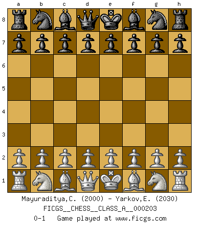 Last move : 0-1 2019 February 14 20:31:10 [Event "FICGS__CHESS__CLASS_A__000203"] [Site "FICGS"] [Date "2019.01.05"] [Round "1"] [White "Mayuraditya,Chandrashekhara"] [Black "Yarkov,Evgeny"] [Result "0-1"] [WhiteElo "2000"] [BlackElo "2030"] 0-1 This chess game has been lost on time (started : 2019.01.05 14:46:38) Player Black won this chess game. Follow this game move after move (download)A thorough understanding of the typical mating continuations makes the most complicated sacrificial combinations leading up to them not only not difficult, but almost a matter of course. (Siegbert Tarrasch) Gewinnen beim Schach fördert das Selbstvertrauen. Beim Sex spüre ich sowas nicht... (Garry Kasparov) El Ajedrez es tortura mental. (Garry Kasparov) On peut tirer plus d'utilité d'une partie perdue que de 100 parties gagnées. (Capablanca) They misunderestimated me. (George W. Bush, Bentonville nov. 6, 2000)