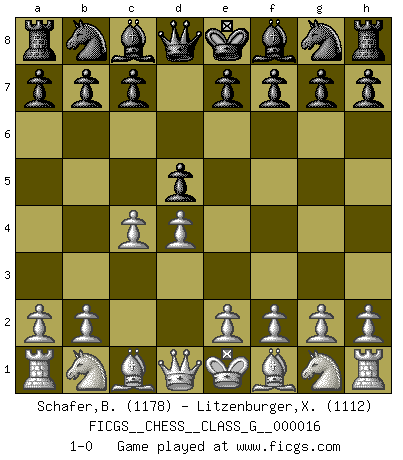 Last move : 1-0 2007 July 9 4:23:17 [Event "FICGS__CHESS__CLASS_G__000016"] [Site "FICGS"] [Date "2007.05.29"] [Round "1"] [White "Schafer,Banner"] [Black "Litzenburger,Xavier"] [Result "1-0"] [WhiteElo "1178"] [BlackElo "1112"] 1.d4 d5 2.c4 1-0 This chess game has been lost on time (started : 2007.05.29 4:43:35) Queen's Gambit Player White won this chess game. Follow this game move after move (download)I guess a certain amount of temperament is expected of Chess geniuses. (Ron Gross) Im Reiche der Wirklichkeit ist man nie so glücklich wie im Reiche der Gedanken. (Arthur Schopenhauer) Hoy en día, si tu no eres un Gran Maestro a los 14 años, es mejor que lo olvides. (Anand Viswanathan) Les échecs sont plus proches de l'art de l'assassinat que de l'art de la guerre. (Arturo Perez-Reverte) The right perception of any matter and a misunderstanding of the same matter do not wholly exclude each other. (Kafka's the trial)