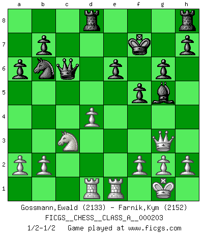 Last move : 1/2-1/2 2019 January 29 13:52:56 [Event "FICGS__CHESS__CLASS_A__000203"] [Site "FICGS"] [Date "2019.01.05"] [Round "1"] [White "Gossmann,Ewald"] [Black "Farnik,Kym"] [Result "1/2-1/2"] [WhiteElo "2133"] [BlackElo "2152"] 1.e4 c5 2.c3 Nf6 3.e5 Nd5 4.Nf3 d6 5.d4 cxd4 6.cxd4 Nc6 7.Bc4 Nb6 8.Bb5 dxe5 9.Nxe5 Bd7 10.Nxd7 Qxd7 11.Nc3 e6 12.O-O a6 13.Bxc6 Qxc6 14.Be3 Be7 15.Qg4 g6 16.Bh6 f5 17.Qg3 Kf7 18.Rad1 Rad8 19.Rfe1 Bf6 20.Bg5 Bxg5 1/2-1/2 Sicilian : Alapin's variation (2.c3) Kingside Castling by player White (move 12) This chess game ended in a draw. Follow this game move after move (download)Chess, like love, like music, has the power to make people happy. (Siegbert Tarrasch) Heutzutage gewinnt im Turnier nicht derjenige Spieler, der weitreichende Pläne entwirft, sondern einfach jener, der Zug um Zug kämpft. (David Bronstein) Si el ingenio solamente fuese necesario para lucirse, las mujeres serían las mejores jugadoras de Ajedrez del mundo. (Albin) On entre au jeu d'Echecs comme on entre en Religion. Pour le joueur d'Echecs, la partie d'Echecs c'est l'office, la messe, le défilé du 1er Mai, le dépôt de gerbe au Monument aux Morts. C'est un drame sacré. (Michel Roos) Vladimir Ras-Putin is still alive... He is also a good actor, I saw him in the Lord of the Rings. (Rodolfo d'Ettorre)