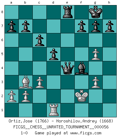 Last move : 1-0 2019 August 11 23:56:37 [Event "FICGS__CHESS__UNRATED_TOURNAMENT__000056"] [Site "FICGS"] [Date "2019.01.06"] [Round "1"] [White "Ortiz,Jose"] [Black "Horoshilov,Andrey"] [Result "1-0"] [WhiteElo "1766"] [BlackElo "1668"] 1.e4 c6 2.Bc4 e6 3.Nf3 d5 4.exd5 exd5 5.Qe2+ Be7 6.Bb3 Bg4 7.O-O Nf6 8.d3 O-O 9.Re1 Re8 10.h3 Bb4 11.c3 Rxe2 12.hxg4 Rxe1+ 13.Nxe1 Qe8 14.Nf3 Bd6 15.g5 Nfd7 16.Be3 Ne5 17.Nxe5 Qxe5 18.g3 Nd7 19.Nd2 Qf5 20.Kh2 Ne5 21.f3 Nxf3+ 22.Kg2 Nxd2 23.Bxd2 Qxd3 24.Rd1 Re8 25.Bf4 Qe4+ 26.Kf1 Bxf4 27.Kf2 1-0 Caro-Kann : Hillbilly attack Kingside Castling by player White (move 7) Kingside Castling by player Black (move 8) Player White won this chess game. Follow this game move after move (download)I give 98 percent of my mental energy to Chess. Others give only 2 percent. (Bobby Fischer) Wenn sie aufgeben, dann danke ich Ihnen für das Spiel (Eventualzug beim Fernschach). (Anonymous) Debemos de asegurarnos de que el Ajedrez no se convierta en un lenguaje muerto, muy interesante, pero tan solo para un grupo muy pequeño. (Sytze Faber) On peut tirer plus d'utilité d'une partie perdue que de 100 parties gagnées. (Capablanca) Don't anthropomorphize computers - they hate it. (Anonymous)