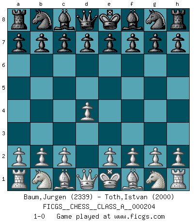 Last move : 1-0 2019 February 16 8:35:52 [Event "FICGS__CHESS__CLASS_A__000204"] [Site "FICGS"] [Date "2019.01.07"] [Round "1"] [White "Baum,Jurgen"] [Black "Toth,Istvan"] [Result "1-0"] [WhiteElo "2339"] [BlackElo "2000"] 1.d4 1-0 This chess game has been lost on time (started : 2019.01.07 6:17:47) Queen's pawn Player White won this chess game. Follow this game move after move (download)I like the moment when I break a man's ego. (Bobby Fischer) Wenn Du nicht kämpfst, um anderen etwas zu beweisen, sondern nur für Dich selbst, dann bist du fast unbesiegbar. (Garry Kasparov) Para mi, el Ajedrez es la vida y cada partida es como una nueva vida. Todo jugador de Ajedrez suele vivir muchas vidas durante su vida. (Eduard Gufeld) Avec des compensations pour le matériel en plus... (Anonyme) Being number two sucks. (Andre Agassi)