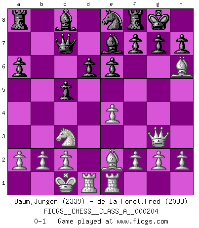 Last move : 0-1 2019 April 4 15:4:2 [Event "FICGS__CHESS__CLASS_A__000204"] [Site "FICGS"] [Date "2019.01.07"] [Round "1"] [White "Baum,Jurgen"] [Black "de la Foret,Fred"] [Result "0-1"] [WhiteElo "2339"] [BlackElo "2093"] 1.e4 c5 2.Nf3 Nc6 3.d4 cxd4 4.Nxd4 Nf6 5.Nc3 d6 6.Bg5 e6 7.Qd3 a6 8.Nxc6 bxc6 9.O-O-O Be7 10.Qg3 Qc7 11.Be2 O-O 12.Bh6 Ne8 13.Rhe1 c5 0-1 Sicilian defense Queenside Castling by player White (move 9) Kingside Castling by player Black (move 11) Player Black won this chess game. Follow this game move after move (download)Chess is a terrible game. If you have no center, your opponent has a freer position. If you do have a center, then you really have something to worry about ! (Siegbert Tarrasch) Die größte Kunst beim Schach besteht darin dem Gegner nicht zu zeigen was er tun kann. (Garry Kasparov) No nos podemos resistir a la fascinación de un sacrificio ya que la pasión por los sacrificios es parte de la naturaleza de un jugador de Ajedrez. (Rudolf Spielman) Tout change constamment, y compris dans le monde des Echecs. (Botvinnik) Nothing is more important for teaching us to understand the concepts we have than constructing fictitious ones. (Ludwig Wittgenstein)