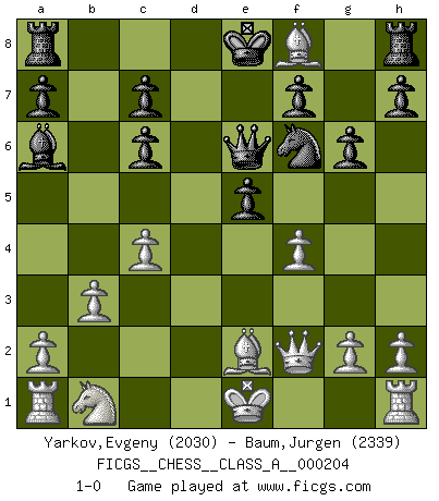 Last move : 1-0 2019 March 21 11:50:56 [Event "FICGS__CHESS__CLASS_A__000204"] [Site "FICGS"] [Date "2019.01.07"] [Round "1"] [White "Yarkov,Evgeny"] [Black "Baum,Jurgen"] [Result "1-0"] [WhiteElo "2030"] [BlackElo "2339"] 1.e4 e5 2.Nf3 Nc6 3.d4 exd4 4.Nxd4 Nf6 5.Nxc6 bxc6 6.e5 Qe7 7.Qe2 Nd5 8.c4 Ba6 9.b3 g6 10.f4 d6 11.Qf2 Nf6 12.Ba3 Qe6 13.Be2 dxe5 14.Bxf8 1-0 Scotch : Mieses variation Player White won this chess game. Follow this game move after move (download)The passion for playing Chess is one of the most unaccountable in the world. (H.G. Wells) Sie bekommen vielleicht den Eindruck, dass die Spitzenspieler überhaupt gar nicht so stark sind. Aber das stimmt nicht. Es ist eine Illusion. Mit einem Computer an der Seite ist es sehr leicht, Urteile zu fällen, aber wenn man alleine am Brett sitzt, sieht die Sache ganz anders aus. (Vladimir Kramnik) El Ajedrez es el gimnasio de la mente. (Blaise Pascal) La conception d'un plan est le processus par lequel un joueur exploite les avantages de sa position tout en s'efforçant d'en réduire au minimum les inconvénients. Afin de garantir le succès, un plan doit toujours se fonder sur un diagnostic objectif des particularités d'une position. La conception d'un plan est d'autant plus difficile que la position est équilibrée, et grandement facilitée lorsqu'il n'existe qu'un seul plan susceptible de répondre aux exigences de la position. (Harry Golombek) The question of whether computers can think is just like question of whether submarines can swim. (Edsger W. Dijkstra)