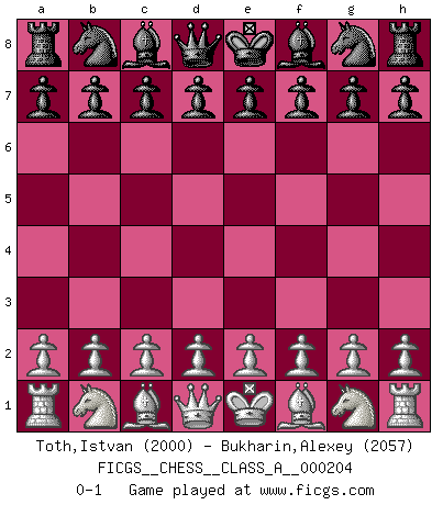Last move : 0-1 2019 February 16 8:35:52 [Event "FICGS__CHESS__CLASS_A__000204"] [Site "FICGS"] [Date "2019.01.07"] [Round "1"] [White "Toth,Istvan"] [Black "Bukharin,Alexey"] [Result "0-1"] [WhiteElo "2000"] [BlackElo "2057"] 0-1 This chess game has been lost on time (started : 2019.01.07 6:17:47) Player Black won this chess game. Follow this game move after move (download)Chess is a terrible game. If you have no center, your opponent has a freer position. If you do have a center, then you really have something to worry about ! (Siegbert Tarrasch) Schach ist mein Leben, meine Leidenschaft, was ich gelernt habe und seit meinem 14. Lebensjahr profimässig praktiziere. Darauf zu verzichten, würde mir sehr schwer fallen. (Viktor Kortschnoi) Cuando le juegas a Fischer, no es una cuestion de si vas a ganar o perder. Es una cuestion de si vas a sobrevivir. (Boris Spassky) Des points faibles ou des trous dans la position de l'adversaire doivent être occupés par des pièces et non pas par des pions. (Siegbert Tarrasch) Work expands to fill the time available. (C. Northcote Parkinson, in Parkinson's Laws)
