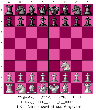 Last move : 1-0 2019 February 16 20:37:34 [Event "FICGS__CHESS__CLASS_A__000204"] [Site "FICGS"] [Date "2019.01.07"] [Round "1"] [White "Duttagupta,Aniruddha"] [Black "Toth,Istvan"] [Result "1-0"] [WhiteElo "2112"] [BlackElo "2000"] 1.Nf3 1-0 This chess game has been lost on time (started : 2019.01.07 6:17:47) Reti Opening Player White won this chess game. Follow this game move after move (download)It is no time to be playing Chess when the house is on fire. (Italian Proverb) Charakterschwächen offenbaren sich normalerweise während einer Schachpartie. (Garry Kasparov) Las combinaciones han sido siempre el aspecto más intrigante del Ajedrez. Los Maestros las buscan, el público las aplauden, los críticos las alaban. La razón se debe a que las combinaciones hacen posible que el Ajedrez sea más que un ejercicio matemático con una carencia de vida. Ellas son la poesía del juego, son del Ajedrez lo que la melodía es de la música. Ellas representan el triunfo de la mente sobre la materia. (Reuben Fine) Donnez-moi un Cavalier en 6e et je gagnerais toutes mes parties. (Steinitz) Hold em is to stud what chess is to checkers. (Johnny Moss)