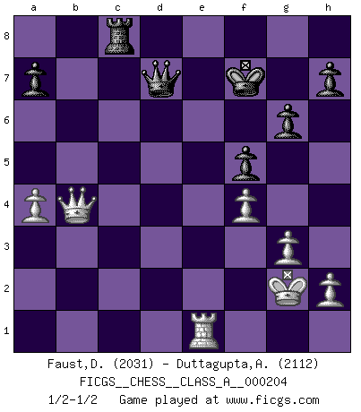 Last move : 1/2-1/2 2019 July 15 18:6:38 [Event "FICGS__CHESS__CLASS_A__000204"] [Site "FICGS"] [Date "2019.01.07"] [Round "1"] [White "Faust,Dieter"] [Black "Duttagupta,Aniruddha"] [Result "1/2-1/2"] [WhiteElo "2031"] [BlackElo "2112"] 1.c4 Nf6 2.Nc3 g6 3.Nf3 Bg7 4.g3 O-O 5.Bg2 Nc6 6.O-O d5 7.cxd5 Nxd5 8.d4 e5 9.Bg5 Nxc3 10.bxc3 f6 11.Be3 e4 12.Nd2 f5 13.f3 exf3 14.Qb3+ Kh8 15.exf3 Be6 16.Qxb7 Nxd4 17.cxd4 Bxd4 18.Rae1 Bxe3+ 19.Rxe3 Qd4 20.Rfe1 Bd5 21.Qxc7 Qxd2 22.Qe5+ Kg8 23.R3e2 Qa5 24.f4 Rad8 25.Rf2 Qb5 26.a4 Qd3 27.Rc2 Bxg2 28.Rc7 Rd7 29.Rxd7 Qxd7 30.Kxg2 Kf7 31.Qc5 Rc8 32.Qb4 1/2-1/2 English Opening Kingside Castling by player Black (move 4) Kingside Castling by player White (move 6) This chess game ended in a draw. Follow this game move after move (download)Do you realize Fischer almost never has any bad pieces? He exchanges them, and the bad pieces remain with his opponents. (Yuri Balashov) Man kann eine Schachpartie nur gewinnen, wenn das Gleichgewicht gestört ist. In einer Stellung mit ungestörtem Gleichgewicht ist auch das größte Genie hilflos - in der Stellung steckt dann eben kein genialer Einfall. (Wilhelm Steinitz) La batalla por la última verdad nunca sera ganada. Y es por eso que el Ajedrez es tan fascinante. (Hans Kmoch) Même un GMI sait rarement calculer sur plus de cinq coups une attaque à sacrifices. (Rudolf Spielmann) For a mechanic, you seem to do an excessive amount of thinking. (C-3PO in Star Wars ep.2)
