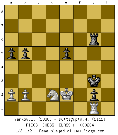 Last move : 1/2-1/2 2019 October 20 10:39:52 [Event "FICGS__CHESS__CLASS_A__000204"] [Site "FICGS"] [Date "2019.01.07"] [Round "1"] [White "Yarkov,Evgeny"] [Black "Duttagupta,Aniruddha"] [Result "1/2-1/2"] [WhiteElo "2030"] [BlackElo "2112"] 1.e4 c5 2.Nf3 d6 3.d4 cxd4 4.Nxd4 Nf6 5.Nc3 a6 6.Be3 e5 7.Nb3 Be6 8.f3 h5 9.Qd2 Nbd7 10.O-O-O Rc8 11.Kb1 Be7 12.g3 b5 13.Nd5 Bxd5 14.exd5 Nb6 15.Bh3 Nc4 16.Qe2 Rc7 17.f4 Ne4 18.Qf3 Nf6 19.Qe2 Ng4 20.Bc1 f5 21.fxe5 dxe5 22.d6 Bxd6 23.Bg2 Qe7 24.h3 Nf6 25.g4 hxg4 26.hxg4 Rxh1 27.Rxh1 fxg4 28.Bg5 Qf7 29.Qd3 Qd7 30.Bxf6 gxf6 31.Be4 Bf8 32.Bg6+ Kd8 33.Rh8 Qxd3 34.Rxf8+ Ke7 35.Re8+ Kd6 36.cxd3 Ne3 37.d4 Rg7 38.dxe5+ fxe5 39.Rd8+ Ke7 40.Rd3 Rxg6 41.Rxe3 g3 42.Re1 Kf6 43.Kc1 g2 44.Rg1 Kf5 45.Kd2 Kf4 46.Ke2 Kg3 47.Nd2 a5 1/2-1/2 Sicilian : Najdorf, Byrne (English) attack Queenside Castling by player White (move 10) This chess game ended in a draw. Follow this game move after move (download)I play correspondence chess because it is both art and science while chess is art only. (A player at FICGS) Ich verstehe mehr vom Schach als irgendein anderer lebender Meister. (José Raúl Capablanca) Robert Fischer es la ley hacia si mismo. (Larry Evans) Botvinnik disait en comparant les échecs à la musique: Il existe une science dont le but est l'étude de l'acoustique et des sons. Mais il y a aussi un art qui se sert de l'océan des sons : c'est la musique. De toute évidence, il en est de même pour la pensée. La logique est l'étude des lois de la réflexion et les échecs reflètent, en tant qu'art, le côté logique de la réflexion, sous la forme d'images artistiques... Extrait de Fischer - Spassky, Reykjavik 1972 par Alexander & F. Wyndham (Ed. Solar), p 37. Quotation,n.: The act of repeating erroneously the words of another. The words erroneously repeated. (Ambrose Bierce, The Devil's Dictionary)