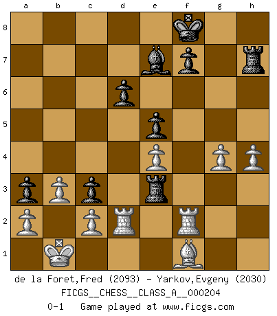Last move : 0-1 2019 April 24 9:27:16 [Event "FICGS__CHESS__CLASS_A__000204"] [Site "FICGS"] [Date "2019.01.07"] [Round "1"] [White "de la Foret,Fred"] [Black "Yarkov,Evgeny"] [Result "0-1"] [WhiteElo "2093"] [BlackElo "2030"] 1.e4 c5 2.Nf3 Nc6 3.d4 cxd4 4.Nxd4 Nf6 5.Nc3 d6 6.Bg5 e6 7.Qd2 a6 8.O-O-O Bd7 9.f4 b5 10.Bxf6 gxf6 11.Kb1 Qb6 12.Nce2 h5 13.h4 b4 14.Rh3 a5 15.Rd3 a4 16.Ng3 Na5 17.Qe2 Nc4 18.Nxh5 Be7 19.Rh3 Rc8 20.Ka1 a3 21.b3 Nb2 22.Rd2 Rc3 23.g4 Kf8 24.Rf3 Qc7 25.Kb1 Qc5 26.Rf2 e5 27.fxe5 fxe5 28.Nf5 Bxf5 29.Rxf5 Re3 30.Qf2 Rh7 31.Nf4 Qc3 32.Nd5 Nd1 33.Nxc3 Nxf2 34.R5xf2 bxc3 0-1 Sicilian defense Queenside Castling by player White (move 8) Player Black won this chess game. Follow this game move after move (download)For me, Chess is life and every game is like a new life. Every Chess player gets to live many lives in one lifetime. (Eduard Gufeld) Das Schachspiel ist ein See, in welchem eine Mücke baden und ein Elefant ertrinken kann. (Emanuel Lasker) El juego del Ajedrez no es solamente una diversión quieta; algunas cualidades muy valuables de la mente se pueden adquirir y cultivar con el, como convertirlos en habitos disponibles para toda ocasión; ya que la vida es algo así como el Ajedrez. (Benjamin Franklin) C'est une question de caractère, Beaucoup de gens perdent leur motivation très vite. D'autres, ils sont rares, peuvent la conserver très longtemps. J'aime les échecs, encore aujourd'hui je suis heureux d'analyser des parties. J'aime toujours gagner, je déteste encore perdre. Bien jouer est important pour mon intégrité intellectuelle et morale. Et puis les échecs vivent en ce moment une période historique grâce à Internet. Ils se développent dans les systèmes éducatifs à travers le monde. Ils sortent de leur ghetto, et c'est mon rôle de mener à bien cette révolution. (Gary Kasparov) It's unlucky to be superstitious. (Dave Enteles)