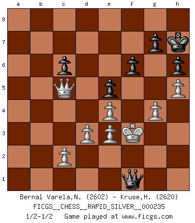Last move : 1/2-1/2 2019 April 10 10:40:43 [Event "FICGS__CHESS__RAPID_SILVER__000235"] [Site "FICGS"] [Date "2019.01.07"] [Round "2"] [White "Bernal Varela,Nelson"] [Black "Kruse,Herbert"] [Result "1/2-1/2"] [WhiteElo "2602"] [BlackElo "2620"] 1.e4 e5 2.Nf3 Nc6 3.Bb5 Nf6 4.d3 Bc5 5.Bxc6 dxc6 6.O-O Qe7 7.Nbd2 Bg4 8.h3 Bh5 9.a3 Nd7 10.b4 Bd6 11.Nc4 O-O 12.g4 Bg6 13.Bd2 Rfe8 14.Ne3 Nf8 15.Nf5 Qd7 16.Kh2 Ne6 17.Rg1 f6 18.Qf1 b6 19.h4 h6 20.Qh3 Kf7 21.a4 Rad8 22.b5 Rf8 23.h5 Bh7 24.Qf1 a5 25.bxc6 Qxc6 26.Qb1 Rd7 27.Qb3 Bc5 28.Qc3 Re8 29.Kg2 Kg8 30.N3h4 Nd8 31.Be3 Bxf5 32.Nxf5 Nb7 33.Qc4+ Kh8 34.Kf3 R7d8 35.Qf7 Rg8 36.Ra2 Bxe3 37.Ne7 Qc5 38.fxe3 Rge8 39.Nf5 Rg8 40.Rga1 Nd6 41.Qb3 Rd7 42.Nxd6 Qxd6 43.Rh1 Kh7 44.Qc4 R7d8 45.Rg1 Qd7 46.Ra3 c6 47.Qa6 Rb8 48.Rb3 Qc7 49.Qc4 Qd7 50.Qa6 Qc7 51.Rf1 Rgc8 52.Rc3 Ra8 53.Qc4 Qd7 54.Qb3 Rcb8 55.Qc4 Rc8 56.Qb3 Rab8 57.Re1 Rg8 58.Rh1 b5 59.Rc5 Rb7 60.axb5 Rxb5 61.Qc4 Rc8 62.Qc3 Rxc5 63.Qxc5 Ra8 64.Ra1 a4 65.Qc4 a3 66.Qc5 Qb7 67.Rxa3 Rxa3 68.Qxa3 Qb1 69.Qc5 Qf1+ 70.Kg3 Qg1+ 71.Kf3 Qf1+ 72.Kg3 Qg1+ 73.Kf3 Qf1+ 1/2-1/2 Ruy Lopez : Berlin defense Kingside Castling by player White (move 6) Kingside Castling by player Black (move 11) This chess game ended in a draw. Follow this game move after move (download)My opponents make good moves too. Sometimes I don't take these things into consideration. (Bobby Fischer) Mit Schach schule ich mein Gefühl für Geometrie, was für Tennis und Schach gleichermaßen wichtig ist. (Boris Becker) Cuando le juegas a Fischer, no es una cuestion de si vas a ganar o perder. Es una cuestion de si vas a sobrevivir. (Boris Spassky) Tous ces prétendus hommes politiques sont les pions, les Cavaliers, les Tours ou les Fous d'une partie d'échecs qui se jouera tant qu'un hasard ne renversera pas l'échiquier. (Honoré de Balzac) No enterprise is more likely to succeed than one concealed from the enemy until it is ripe for execution. (Niccolo Machiavelli)