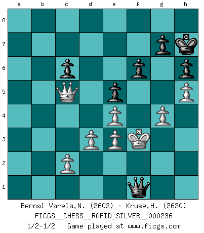 Last move : 1/2-1/2 2019 April 10 22:2:22 [Event "FICGS__CHESS__RAPID_SILVER__000236"] [Site "FICGS"] [Date "2019.01.07"] [Round "2"] [White "Bernal Varela,Nelson"] [Black "Kruse,Herbert"] [Result "1/2-1/2"] [WhiteElo "2602"] [BlackElo "2620"] 1.e4 e5 2.Nf3 Nc6 3.Bb5 Nf6 4.d3 Bc5 5.Bxc6 dxc6 6.O-O Qe7 7.Nbd2 Bg4 8.h3 Bh5 9.a3 Nd7 10.b4 Bd6 11.Nc4 O-O 12.g4 Bg6 13.Bd2 Rfe8 14.Ne3 Nf8 15.Nf5 Qd7 16.Kh2 Ne6 17.Rg1 f6 18.Qf1 b6 19.h4 h6 20.Qh3 Kf7 21.a4 Rad8 22.b5 Rf8 23.h5 Bh7 24.Qf1 a5 25.bxc6 Qxc6 26.Qb1 Rd7 27.Qb3 Bc5 28.Qc3 Re8 29.Kg2 Kg8 30.N3h4 Nd8 31.Be3 Bxf5 32.Nxf5 Nb7 33.Qc4+ Kh8 34.Kf3 R7d8 35.Qf7 Rg8 36.Ra2 Bxe3 37.Ne7 Qc5 38.fxe3 Rge8 39.Nf5 Rg8 40.Rga1 Nd6 41.Qb3 Rd7 42.Nxd6 Qxd6 43.Rh1 Kh7 44.Qc4 R7d8 45.Rg1 Qd7 46.Ra3 c6 47.Qa6 Rb8 48.Rb3 Qc7 49.Qc4 Qd7 50.Qa6 Qc7 51.Rf1 Rgc8 52.Rc3 Ra8 53.Qc4 Qd7 54.Qb3 Rcb8 55.Qc4 Rc8 56.Qb3 Rab8 57.Re1 Rg8 58.Rh1 b5 59.Rc5 Rb7 60.axb5 Rxb5 61.Qc4 Rc8 62.Qc3 Rxc5 63.Qxc5 Ra8 64.Ra1 a4 65.Qc4 a3 66.Qc5 Qb7 67.Rxa3 Rxa3 68.Qxa3 Qb1 69.Qc5 Qf1+ 70.Kg3 Qg1+ 71.Kf3 Qf1+ 72.Kg3 Qg1+ 73.Kf3 Qf1+ 1/2-1/2 Ruy Lopez : Berlin defense Kingside Castling by player White (move 6) Kingside Castling by player Black (move 11) This chess game ended in a draw. Follow this game move after move (download)Strategy requires thought, tactics require observation. (Max Euwe) Die Arbeit ist etwas Unnatürliches. Die Faulheit allein ist göttlich. (Anatole France) La esencia del Ajedrez es pensar acerca de lo que el Ajedrez es. (David Bronstein) Les pièces de l'échiquier étaient impitoyables. Elles le retenaient, elles l'absorbaient. Il y avait de l'horreur en cela, mais aussi une harmonie unique. Car, qu'y a-t-il dans le monde, à part les échecs ? (V. Nabokov) Perhaps chess is the wrong game for the times (The Chess Master and the Computer, by Garry Kasparov - 2010)