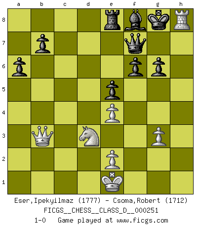 Last move : 1-0 2019 March 18 22:39:16 [Event "FICGS__CHESS__CLASS_D__000251"] [Site "FICGS"] [Date "2019.01.07"] [Round "1"] [White "Eser,Ipekyilmaz"] [Black "Csoma,Robert"] [Result "1-0"] [WhiteElo "1777"] [BlackElo "1712"] 1.a3 c5 2.d3 d5 3.d4 cxd4 4.Qxd4 Nc6 5.Qd1 e5 6.g3 Nf6 7.Bg5 Be7 8.Bxf6 Bxf6 9.Bg2 Be6 10.h3 O-O 11.h4 Rc8 12.Nh3 Qd7 13.Nd2 Nd4 14.c3 Nf5 15.Rc1 Qb5 16.Qc2 d4 17.Be4 g6 18.Bxf5 Bxf5 19.Qb3 Qa6 20.h5 Be6 21.Qc2 Bd5 22.f3 dxc3 23.Ne4 Bxe4 24.fxe4 cxb2 25.Qxb2 Rxc1+ 26.Qxc1 Be7 27.Nf2 Bxa3 28.Qc3 Qd6 29.Nd3 Re8 30.hxg6 hxg6 31.Qa5 a6 32.Qd2 Qf6 33.Qh6 Qg7 34.Qe3 Bf8 35.Qb6 f6 36.Qb3+ Qf7 37.Rh8+ 1-0 Anderssen's Opening Kingside Castling by player Black (move 10) Player White won this chess game. Follow this game move after move (download)Chess is mental torture. (Garry Kasparov) Mein Name ist Rustam Kamsky. Sie haben meinen Sohn belästigt. Bereiten Sie sich aufs Sterben vor. (Rustam Kamsky) El Ajedrez hace al hombre ser mas sabio y ver mas claro. (Vladimir Putin) D'abord les bases : Jouez et étudiez, puis étudiez et jouez, ensuite jouez et étudiez, puis étudiez et jouez. Deuxièmement : Donnez toujours le meilleur de vous-même ! (Ken Smith) If we knew what we were doing, we would not call it research. (Albert Einstein)