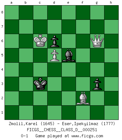 Last move : 0-1 2019 August 1 8:39:49 [Event "FICGS__CHESS__CLASS_D__000251"] [Site "FICGS"] [Date "2019.01.07"] [Round "1"] [White "Zmolil,Karel"] [Black "Eser,Ipekyilmaz"] [Result "0-1"] [WhiteElo "1645"] [BlackElo "1777"] 1.e4 f6 2.f4 e6 3.Be2 f5 4.exf5 exf5 5.Nf3 b6 6.Ne5 d6 7.Nf3 Bb7 8.Nc3 Bxf3 9.Bxf3 c6 10.O-O Nf6 11.d3 Be7 12.Nb5 cxb5 13.Bxa8 Qc7 14.Bf3 a6 15.Be3 a5 16.c3 Na6 17.Rc1 Nc5 18.Qe2 Kf7 19.d4 Nce4 20.Qxb5 g6 21.d5 Rb8 22.Bd4 Nd2 23.Rf2 Nxf3+ 24.gxf3 Nh5 25.Be3 Bh4 26.Re2 Kg8 27.Bd4 Qd8 28.Be3 Be7 29.Bd2 Bh4 30.Rd1 Kf8 31.Bc1 Rc8 32.Rd3 Kg8 33.Rde3 Ng7 34.b3 Rc5 35.Re8+ Nxe8 36.Rxe8+ Kf7 37.Rxd8 Rxb5 38.c4 Rxd5 39.cxd5 Bxd8 40.Kf2 b5 41.a4 b4 42.Be3 Ke7 43.Ke2 Kd7 44.Kd3 Kc7 45.Kc4 Kb7 46.Kb5 Bc7 47.Bd4 Bd8 48.Bg7 Bb6 49.Bf6 Be3 50.Bg5 Bg1 51.h3 Bb6 52.Be7 Bc5 53.Bd8 Be3 54.Bxa5 Bxf4 55.Bxb4 g5 56.a5 h6 57.a6+ Ka7 58.Kc6 h5 59.Be1 g4 60.fxg4 hxg4 61.hxg4 fxg4 62.Bf2+ Kxa6 63.b4 Bd2 64.b5+ Ka5 65.b6 Bf4 66.b7 Kb4 67.b8Q+ Kc3 68.Qe8 Be5 69.Qg6 g3 0-1 Barnes defense Kingside Castling by player White (move 10) 10 pieces endgame at move 61 : White KBPPPP , Black KBPP WHITE : King + 1 Bishop 4 Pawns BLACK : King + 1 Bishop 2 Pawns 9 pieces endgame at move 61 : White KBPPP , Black KBPP WHITE : King + 1 Bishop 3 Pawns BLACK : King + 1 Bishop 2 Pawns 8 pieces endgame at move 62 : White KBPP , Black KBPP WHITE : King + 1 Bishop 2 Pawns BLACK : King + 1 Bishop 2 Pawns Promotion Queen by player White (move 67) Player Black won this chess game. Follow this game move after move (download)An attack on the wing should be met by play in the center. (Nimzovitch) Der Schachmeister von Heute braucht Courage, einen Killerinstinkt, Ausdauer und Arroganz. (Larry Evans) Un entendimiento minucioso de las típicas continuaciones de mate hacen de las mas complicadas combinaciones de sacrificio que conducen hacia ellas no solo no dificiles, sino casi un asunto de rutina. (Siegbert Tarrasch) Un journaliste : 'Vous préférez avoir une dame de plus sur l'échiquier ou au lit ?' Boris Spassky : 'Ca dépend de la position.' If only people were all showed a certain minimum level of niceness; if only people didn't retract verbal draw offers (without draw box ticked) on ficgs; if only people didn't kill; if only people didn't run concentration / extermination camps, if only people didn't drop nuclear bombs on Hiroshima and Nagasaki, and so on - it would be a much more beautiful world. But sadly, things are not so... (Normajean Yates)