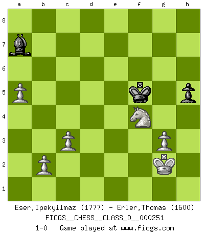 Last move : 1-0 2019 March 9 8:57:14 [Event "FICGS__CHESS__CLASS_D__000251"] [Site "FICGS"] [Date "2019.01.07"] [Round "1"] [White "Eser,Ipekyilmaz"] [Black "Erler,Thomas"] [Result "1-0"] [WhiteElo "1777"] [BlackElo "1600"] 1.a3 e5 2.d3 d5 3.d4 Nc6 4.dxe5 Nxe5 5.Nf3 Nxf3+ 6.exf3 Nf6 7.Bg5 Be7 8.Bxf6 Bxf6 9.c3 O-O 10.Bd3 Re8+ 11.Kf1 c6 12.Nd2 b5 13.Qc2 a5 14.Re1 g6 15.Rxe8+ Qxe8 16.h3 Be6 17.h4 Qe7 18.h5 Ra7 19.h6 Bg5 20.g3 Qf8 21.f4 Bxh6 22.f5 Bxf5 23.Bxf5 gxf5 24.Kg2 f6 25.Nf1 Bg5 26.Qxf5 Qe7 27.Qc8+ Qf8 28.Qxc6 Qf7 29.Qxb5 Rb7 30.Qe2 Re7 31.Qc2 Qe6 32.Nh2 Qe4+ 33.Qxe4 dxe4 34.Re1 f5 35.Rd1 Kg7 36.Rd5 Kf6 37.Rxa5 Bc1 38.Rb5 e3 39.fxe3 Rxe3 40.Kf2 Re6 41.a4 Be3+ 42.Kf1 h5 43.Nf3 Ba7 44.a5 Re3 45.Nh4 Re5 46.Rxe5 Kxe5 47.Kg2 f4 48.Ng6+ Kf5 49.Nxf4 1-0 Anderssen's Opening Kingside Castling by player Black (move 9) 10 pieces endgame at move 46 : White KNPPPP , Black KBPP WHITE : King + 1 Knight 4 Pawns BLACK : King + 1 Bishop 2 Pawns 9 pieces endgame at move 49 : White KNPPPP , Black KBP WHITE : King + 1 Knight 4 Pawns BLACK : King + 1 Bishop 1 Pawn Player White won this chess game. Follow this game move after move (download)Chess demands total concentration. (Bobby Fischer) Ich kenne Menschen, die allen Willen der Welt besitzen und doch nicht Schach spielen können. (Robert James Fischer) Robert Fischer es la ley hacia si mismo. (Larry Evans) Karpov est une pièce de musée. (Garry Kasparov) You cannot beat a roulette table unless you steal money from it. (Albert Einstein)