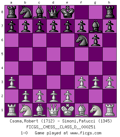 Last move : 1-0 2019 February 18 8:39:2 [Event "FICGS__CHESS__CLASS_D__000251"] [Site "FICGS"] [Date "2019.01.07"] [Round "1"] [White "Csoma,Robert"] [Black "Simoni,Patucci"] [Result "1-0"] [WhiteElo "1712"] [BlackElo "1345"] 1.f3 Nf6 2.g3 g6 3.h3 Bg7 4.a3 1-0 This chess game has been lost on time (started : 2019.01.07 19:17:51) Gedult's Opening Player White won this chess game. Follow this game move after move (download)Bobby Fischer is the greatest Chess player who has ever lived. (Ken Smith) Das Schachspiel hat wie die Liebe, die Musik, die Fähigkeit, den Menschen glücklich zu machen. Ich habe ein leises Gefühl des Bedauerns für jeden, der das Schachspiel nicht kennt, so wie ich jeden bedaure, der die Liebe nicht kennt. (Siegbert Tarrasch) Si un gobernante no entiende al Ajedrez, ¿como puede governar él un reinado?. (El Rey Khusros II) Les Cavaliers se révèlent fort utiles dans les positions fermées. D'habitude, les Fous sont un peu plus forts que les Cavaliers dans les positions ouvertes. Qu'on le veuille ou non, il restera toujours des exceptions ! Are you threatening me, Master Jedi ? (Chancellor Palpatine in Star Wars ep.3)