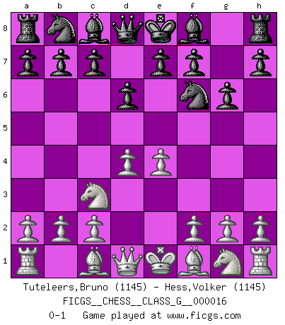 Last move : 0-1 2007 July 9 4:23:17 [Event "FICGS__CHESS__CLASS_G__000016"] [Site "FICGS"] [Date "2007.05.29"] [Round "1"] [White "Tuteleers,Bruno"] [Black "Hess,Volker"] [Result "0-1"] [WhiteElo "1145"] [BlackElo "1145"] 1.e4 d6 2.d4 Nf6 3.Nc3 g6 0-1 This chess game has been lost on time (started : 2007.05.29 4:43:35) Pirc defense Player Black won this chess game. Follow this game move after move (download)A Chess game is divided into three stages: the first, when you hope you have the advantage, the second when you believe you have an advantage, and the third... when you know you're going to lose ! (Savielly Tartakower) Ich las kürzlich ein Buch von Nietzsche. Er sagte Religion verdumme nur die Menschen. Ich stimme zu. (Robert James Fischer) Cuando tu no sabes absolutamente que mas hacer, es tiempo de entrar en pánico. (John van der Wiel) L'attaque fait le spectacle, la défense gagne les matchs. (Dicton footballistique) Luck is the residue of design. (John Milton)
