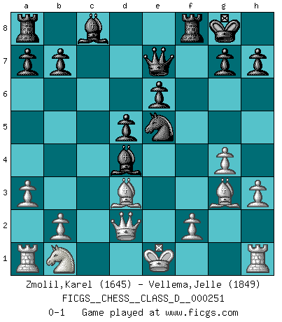 Last move : 0-1 2019 January 15 15:37:20 [Event "FICGS__CHESS__CLASS_D__000251"] [Site "FICGS"] [Date "2019.01.07"] [Round "1"] [White "Zmolil,Karel"] [Black "Vellema,Jelle"] [Result "0-1"] [WhiteElo "1645"] [BlackElo "1849"] 1.e4 e6 2.d4 d5 3.e5 c5 4.c3 Nc6 5.Nf3 Nge7 6.h3 Nf5 7.g4 Nh4 8.Nxh4 Qxh4 9.Be3 cxd4 10.cxd4 f6 11.Bf4 fxe5 12.dxe5 Bc5 13.Bg3 Qe7 14.a3 O-O 15.Bd3 Bd4 16.Qd2 Nxe5 0-1 French : Advance, Paulsen attack Kingside Castling by player Black (move 14) Player Black won this chess game. Follow this game move after move (download)The sign of a great Master is his ability to win a won game quickly and painlessly. (Irving Chernev) Schach ist mein Leben, meine Leidenschaft, was ich gelernt habe und seit meinem 14. Lebensjahr profimässig praktiziere. Darauf zu verzichten, würde mir sehr schwer fallen. (Viktor Kortschnoi) Cuando tu no sabes absolutamente que mas hacer, es tiempo de entrar en pánico. (John van der Wiel) On a dit que l'homme se distingue de l'animal par le fait qu'il achète plus de livres qu'il ne peut en lire. Je voudrais suggérer qu'inclure à la liste des livres quelques livres d'échecs rendrait la distinction manifeste. (Edward Lasker) The obstacle is the path. (Zen proverb)
